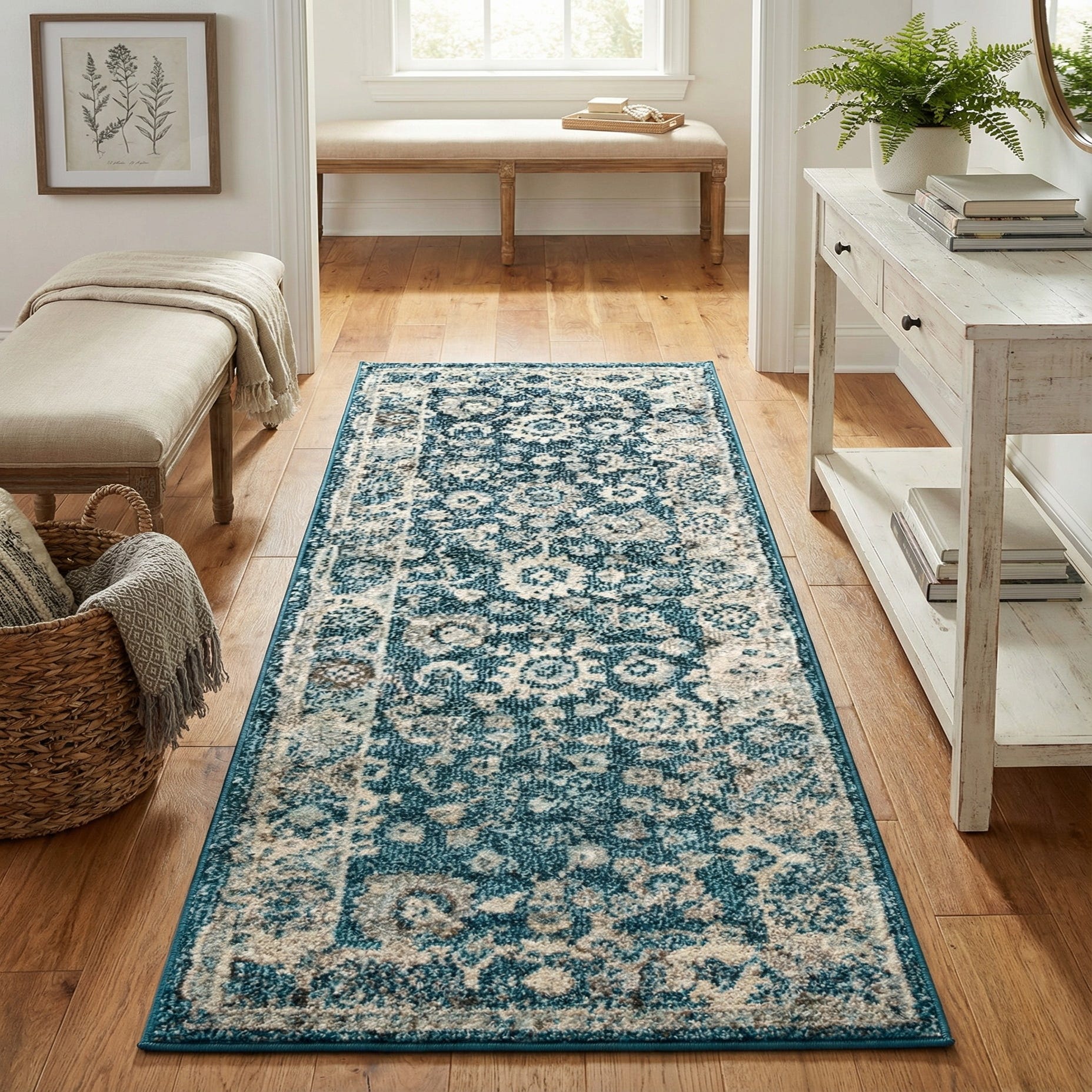 Machine-made from 100% polypropylene, the rug delivers a low-profile, tightly woven surface that feels softly textured underfoot while retaining clear pattern definition. The fiber has a subtle sheen that lifts the turquoise and blue tones, while the beige and light brown add warmth and balance. Ideal as a hallway or entry runner, it pairs well with coastal, transitional, or casual contemporary interiors—think light oak floors, white or sand-colored upholstery, and mixed-metal accents for a relaxed, cohesive look.
