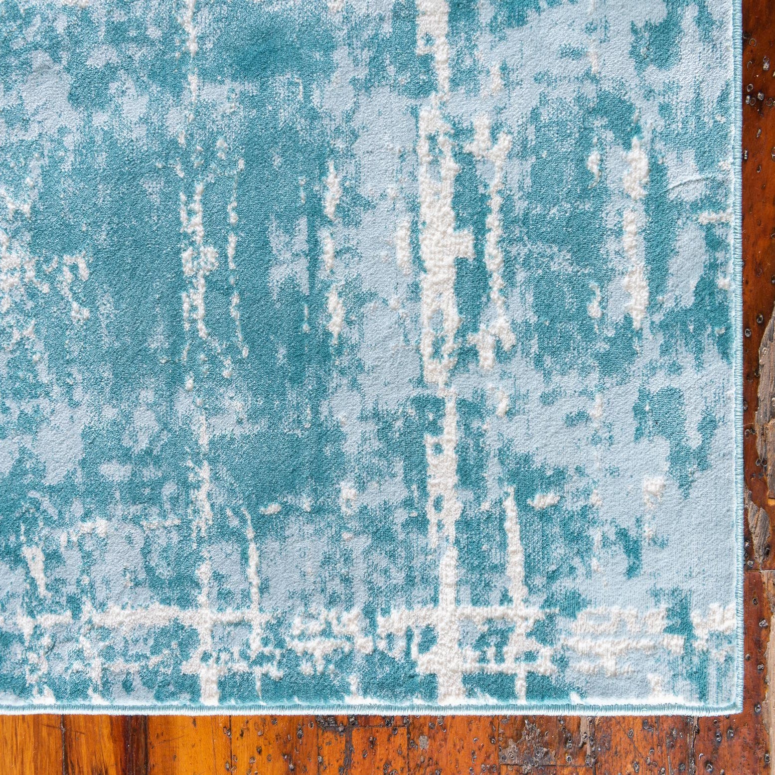 A painterly, distressed grid pattern rests on a turquoise field, with strokes of ivory and light blue woven into an irregular plaid that feels hand-aged and contemporary at once. The design has a soft, layered look—intersecting lines and worn patches create visual movement without sharp contrast. Machine made from 70% polypropylene and 30% polyester, the rug has a low-profile, smooth pile with a soft hand and a subtle sheen from the synthetic fibers that gives the surface a gentle, tactile quality.