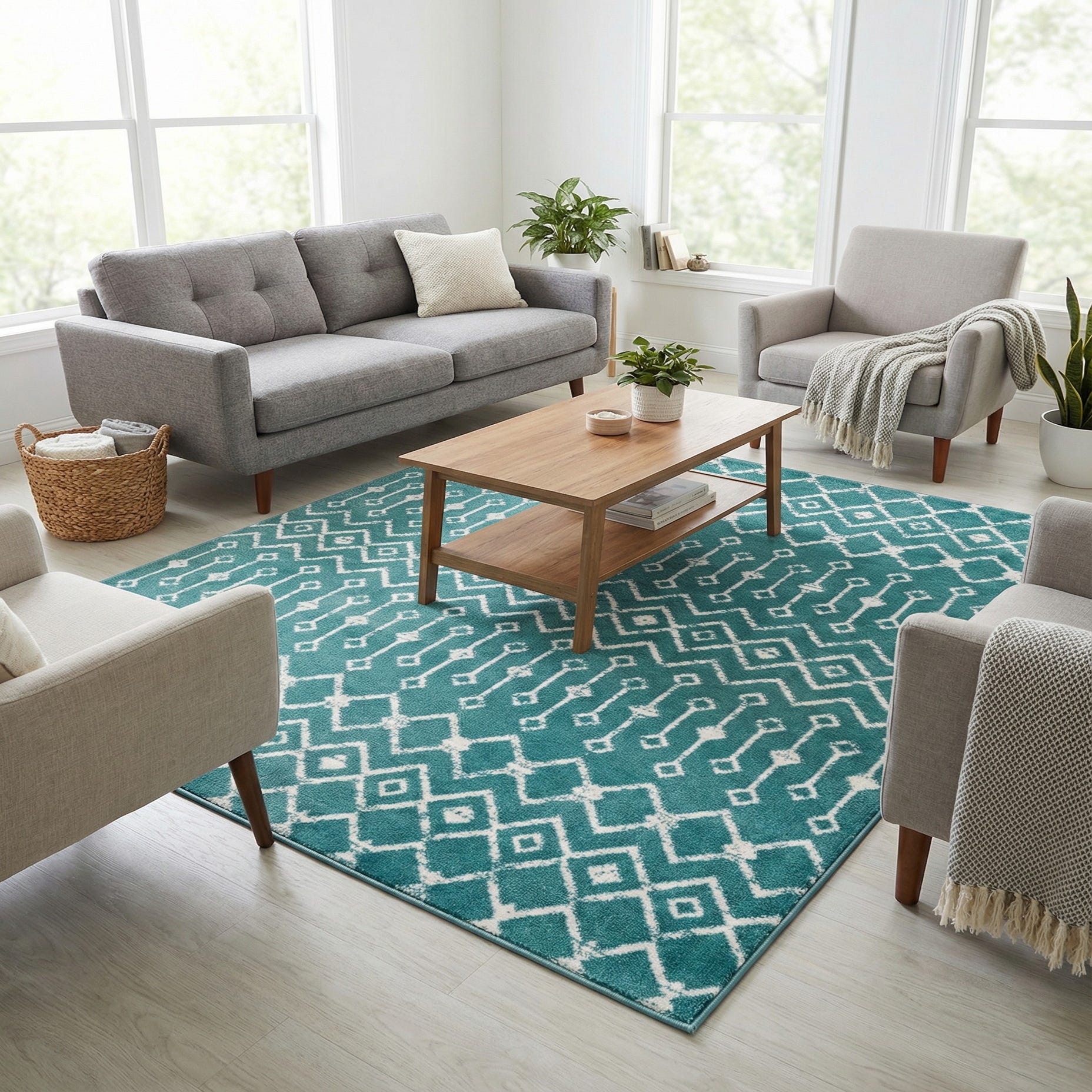 A lively trellis pattern of ivory diamonds, zigzags and linear key motifs sits on a turquoise ground, creating a balanced geometric layout with a hand-drawn quality. The contrast between the crisp ivory motifs and the saturated turquoise background gives the design a fresh, coastal-meets-global look. Machine made from 100% polypropylene, the rug has a low, dense pile that feels soft underfoot while maintaining a structured surface that drapes cleanly beneath furniture.