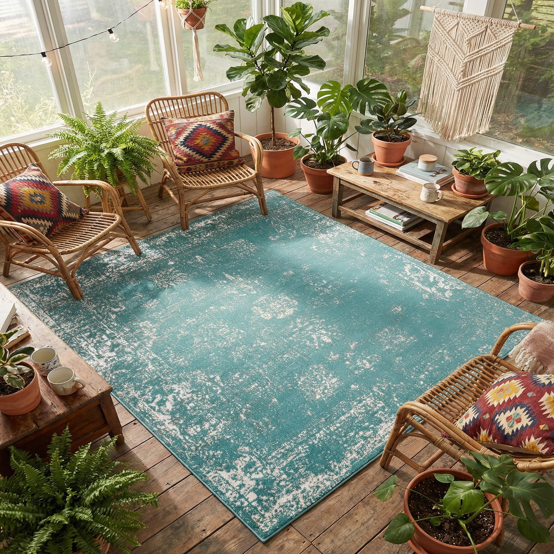 This Monte Carlo rug is versatile in its application, harmonizing well with contemporary, transitional, or coastal-inspired decors. It could serve as a refreshing centerpiece in a minimalist setting or complement a room with natural wood elements and soft, neutral tones. Its resilient material makes it an appropriate choice for high-traffic areas such as living rooms, dining spaces, or home offices.