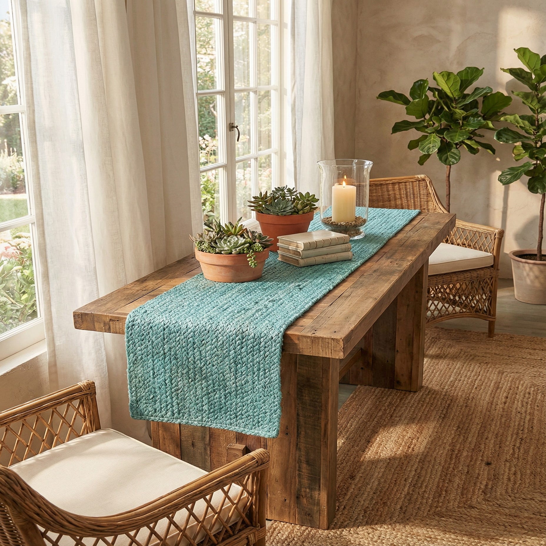 Hand-braided from 100% jute, this table runner displays a classic lengthwise braided pattern in a turquoise field with natural tonal variation and occasional flecks of raw fiber. The flat, tightly woven braids create a low-profile surface with a slightly nubby, organic texture that feels sturdy and tactile under your hand. Subtle shifts in color across the braids add depth without overpowering a tabletop or narrow surface.