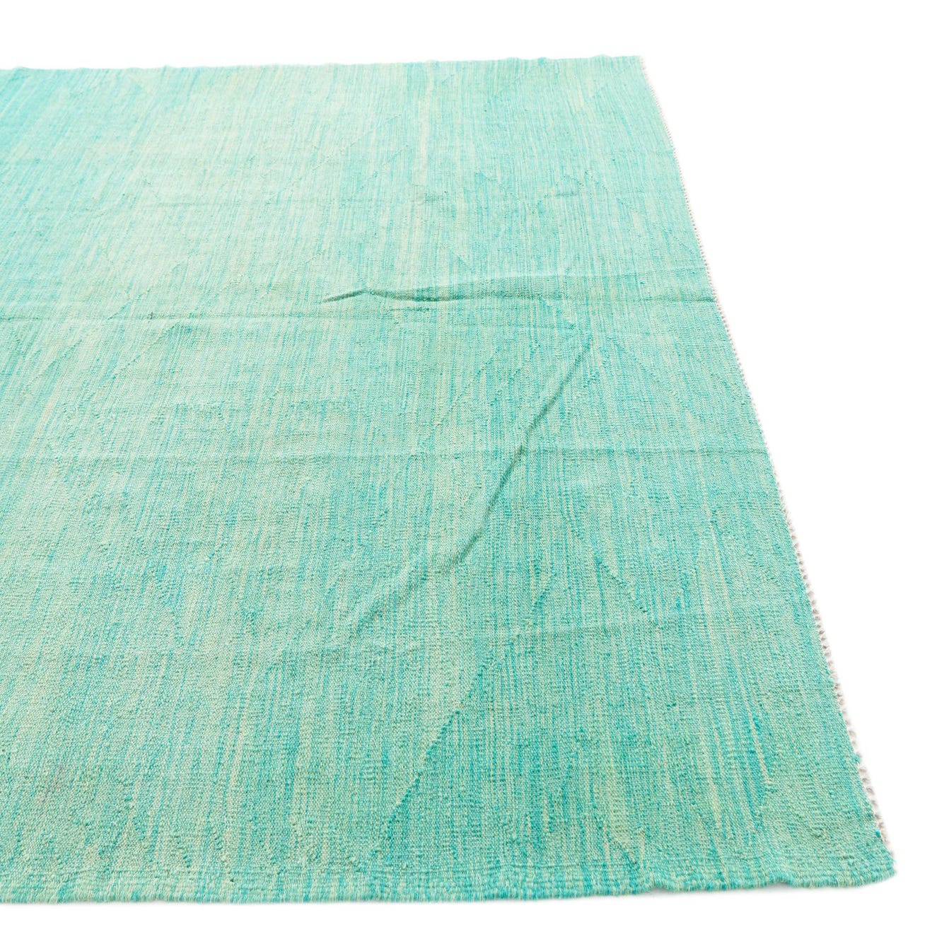The Kilim Modern Collection presents a hand-woven rug crafted from 100% wool with a dimension of 6x9 feet, featuring a dynamic blend of turquoise and beige hues. This rug boasts a predominantly turquoise background, vividly complementing its lighter accents to create a serene yet lively tapestry for any living space. Its flatweave construction lends a textural feel underfoot, while the incorporation of fringe adds a traditional touch to its otherwise minimalistic and contemporary design.
