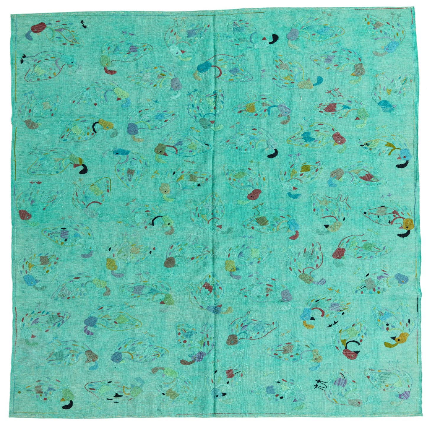 Primary color is Turquoise. Colors in this rug include: Turquoise, Beige, Brown, Blue, Light Blue, Light Brown, Light Green, Light Salmon, Yellow, Red, Navy Blue.