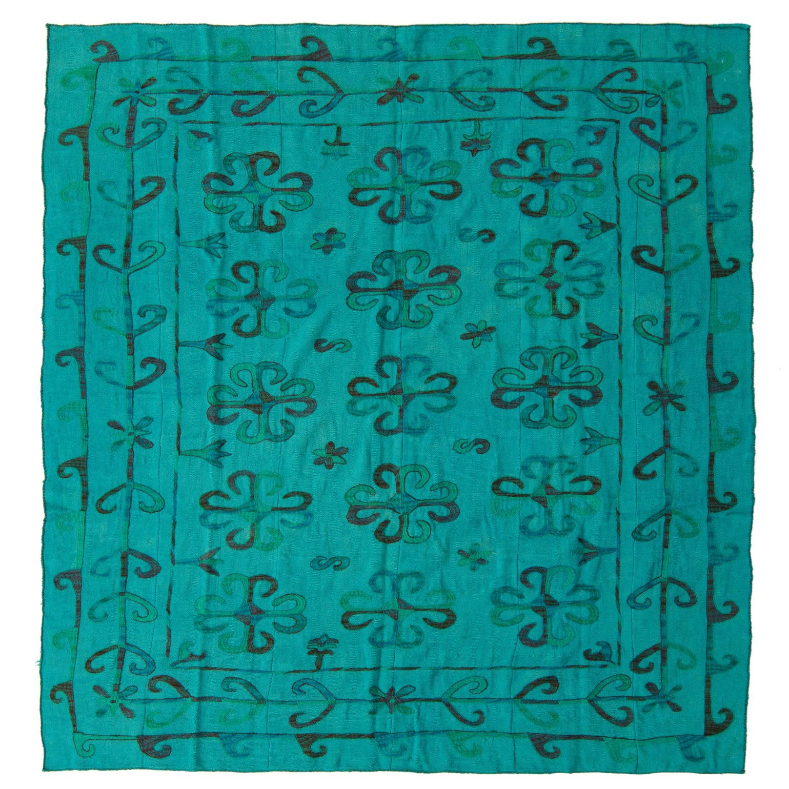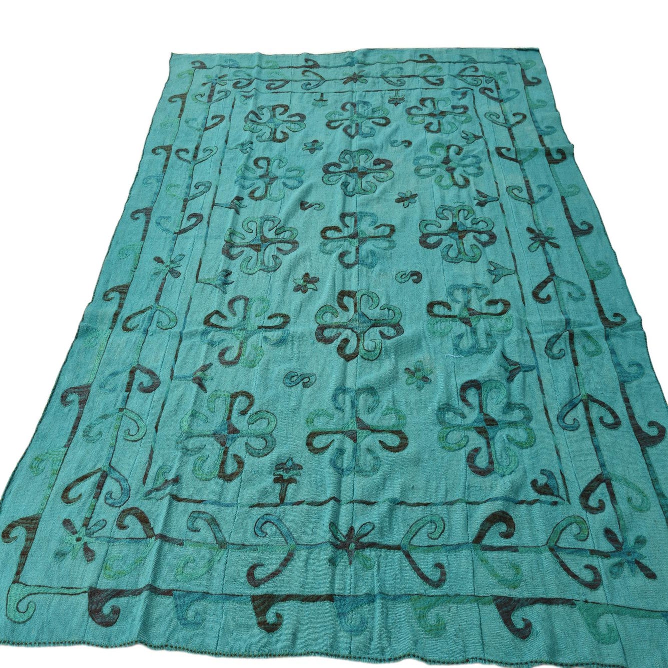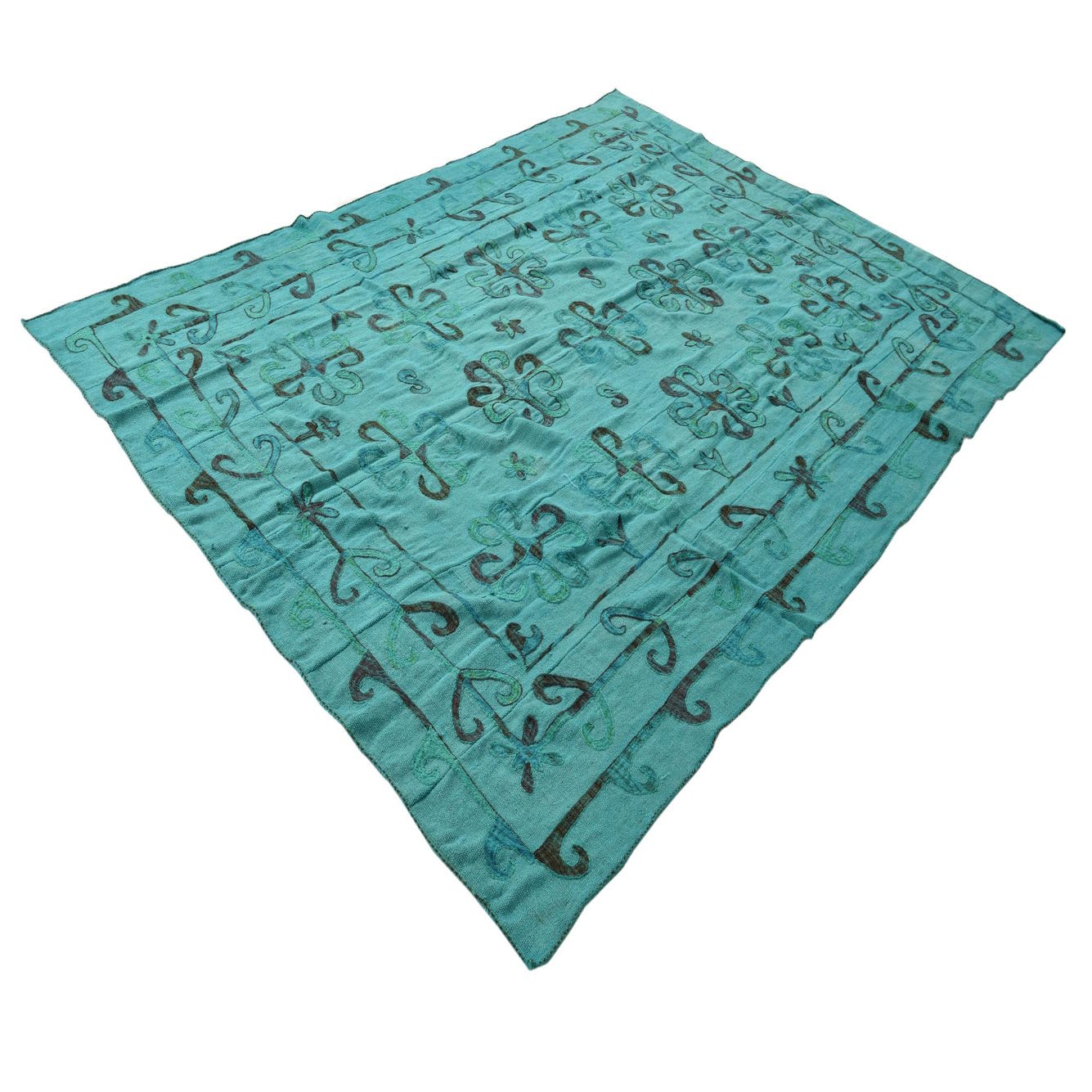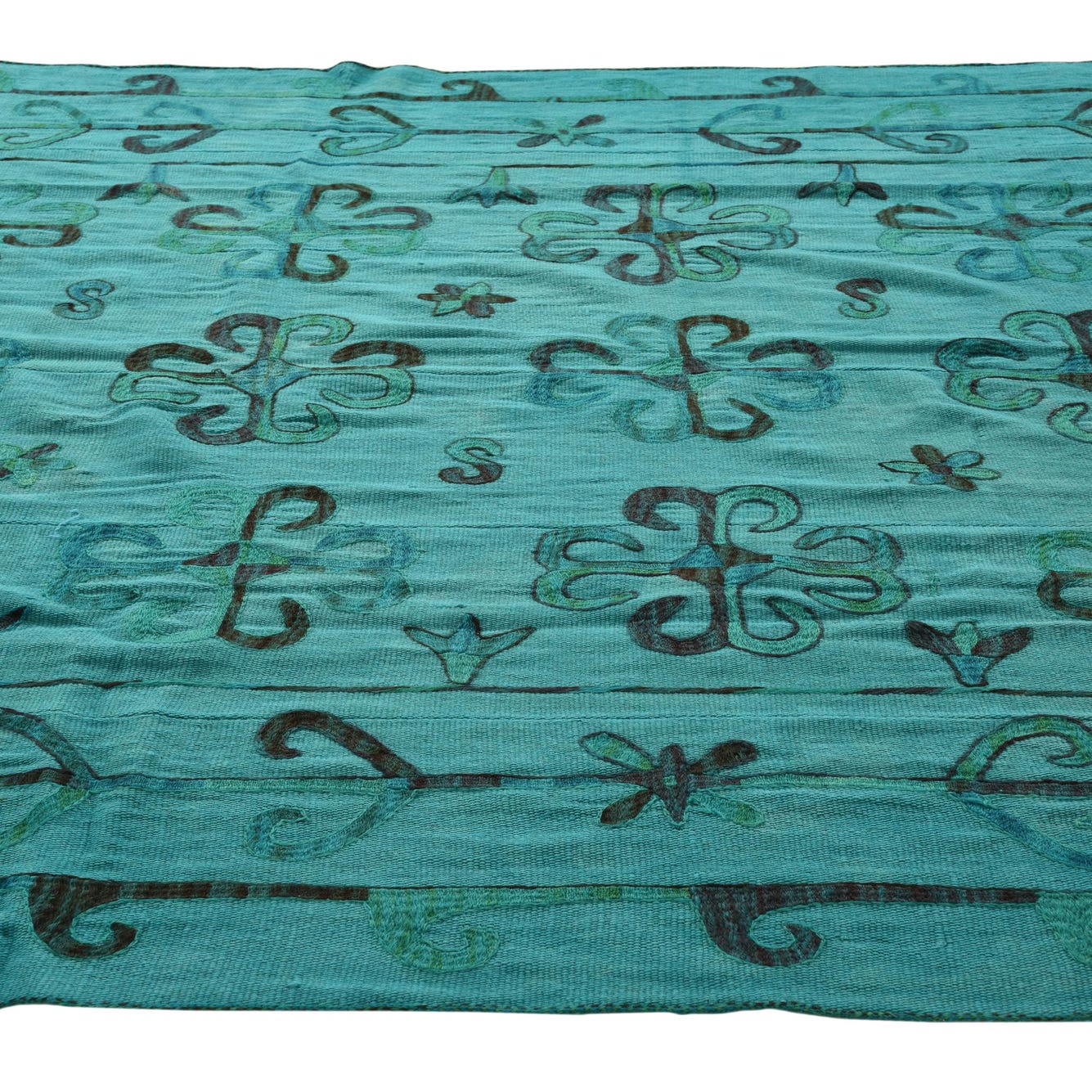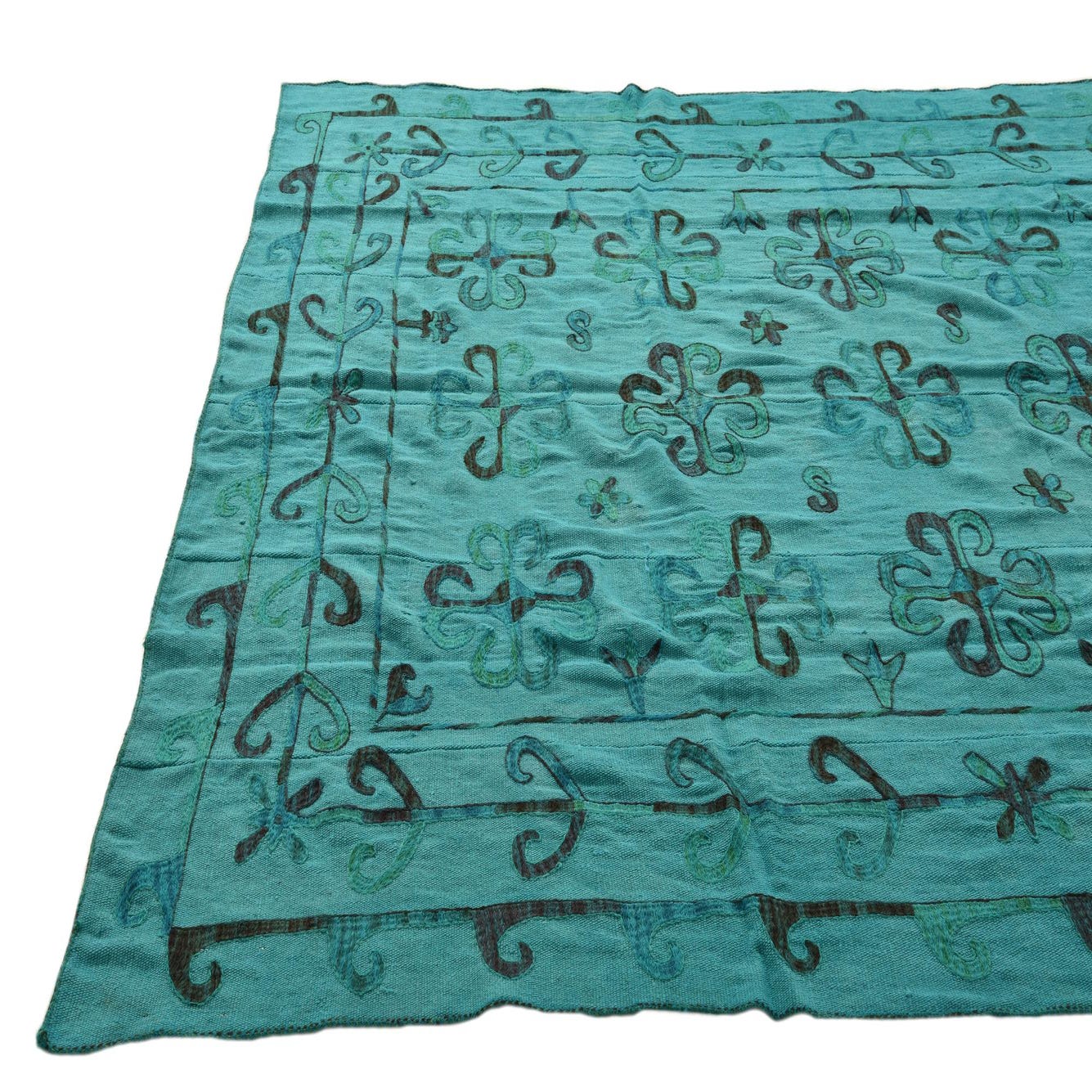 The Kilim Suzani collection presents a hand-woven 6x9 wool rug that comes alive with its vibrant turquoise background and a harmonious blend of blue, teal, and red accents. The inherent texture of the hand-woven wool construction adds depth to the tactile experience of the rug. Its pattern features stylized floral motifs and decorative vines, creating a symmetrical arrangement that echoes traditional Suzani textiles. This rug's flatweave design ensures it is durable and offers a lightweight feel, suitable for various settings.