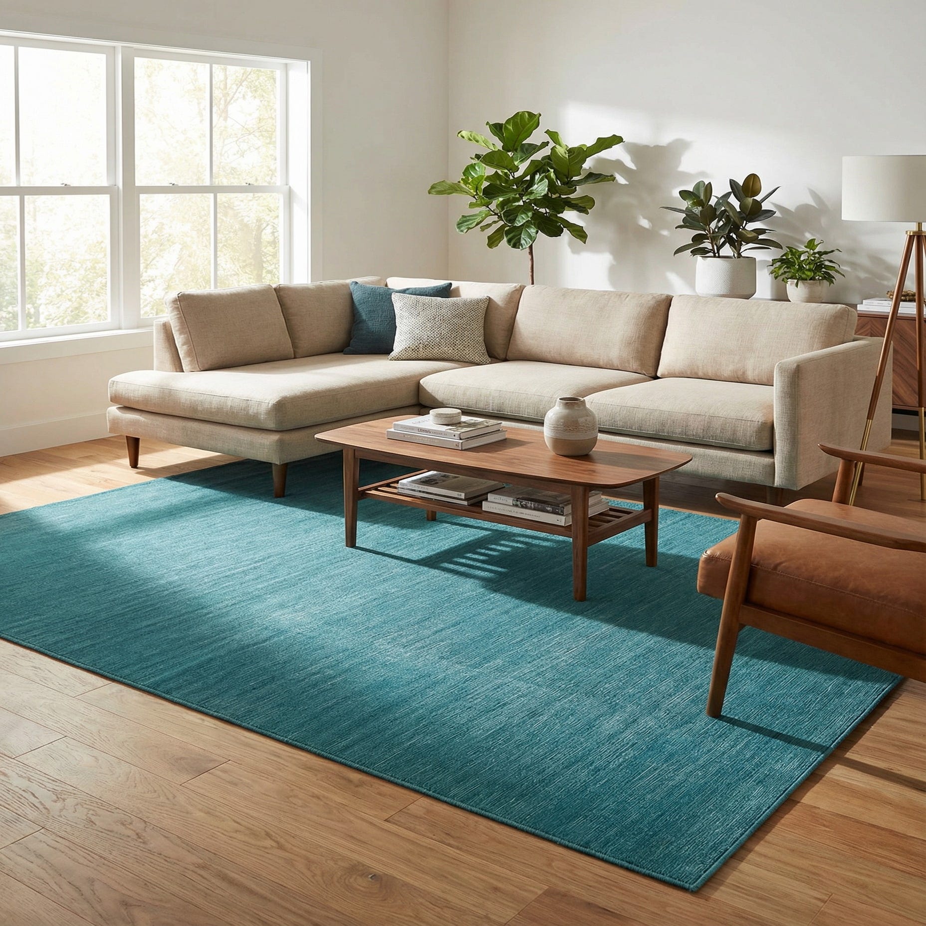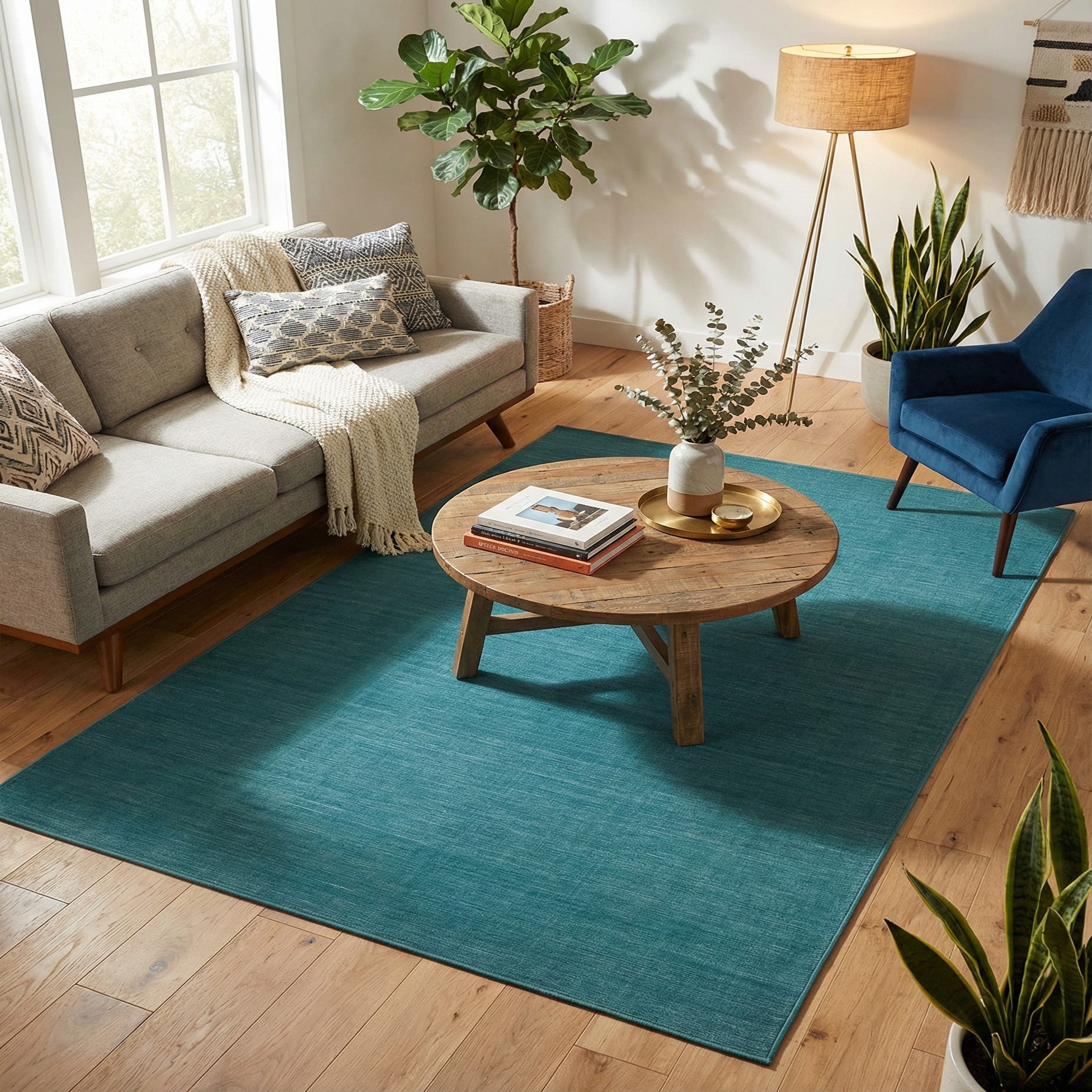 Due to its stain-resistant and shed-free properties, this rug would work well in high-traffic areas such as living rooms, dining spaces, or entryways. The tranquil color scheme can serve as a calming foundation, complementing neutral furnishings and accent pieces with similar hues or those in natural wood and metals, to create a cohesive and harmonious environment.