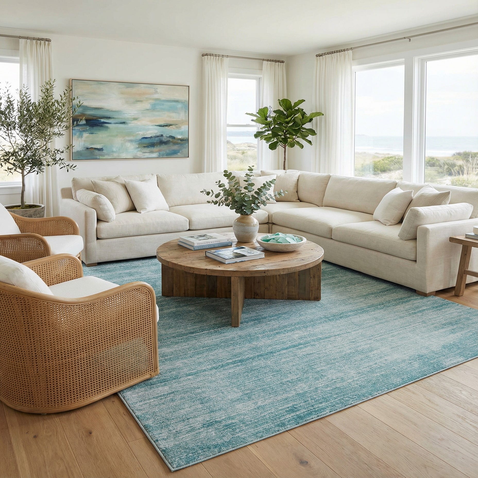 Made of 70% polypropylene and 30% polyester, the rug has a low, dense pile with a soft hand that lies close to the floor and a smooth, even texture underfoot. Use it to anchor a living room seating group, provide a tranquil base in a bedroom, or add a quiet wash of color to a home office. It pairs well with white or light-wood furniture, pale leathers and linens, and metal accents in brass or matte black for a balanced, contemporary aesthetic.
