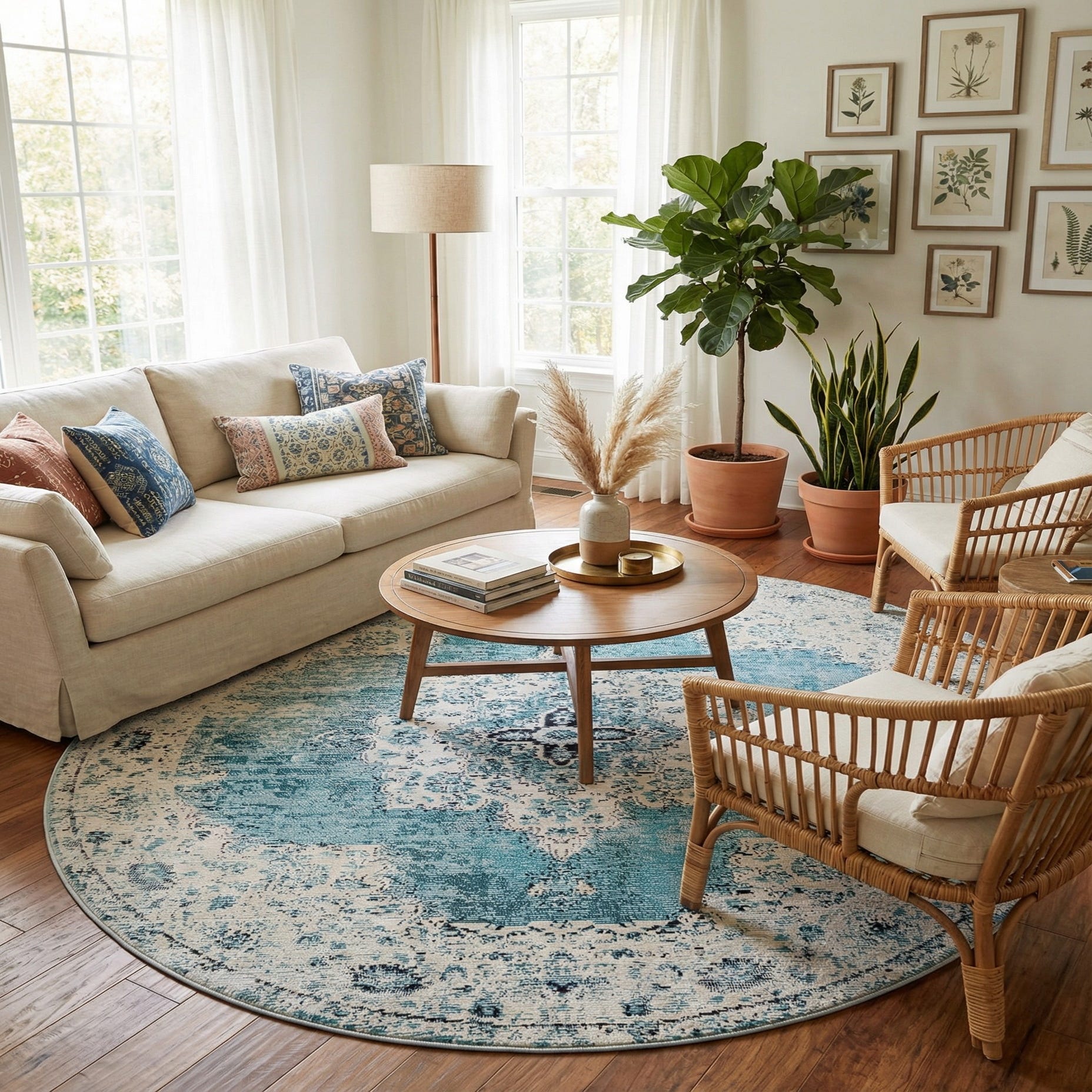 This rug suits coastal, transitional, or modern farmhouse settings—pair it with whitewashed wood, rattan accents, or navy-upholstered seating to echo the color story. Its circular shape defines seating areas and works well beneath a round dining table, in a cozy reading nook, or as a soft focal point in a living room with neutral furnishings. Use it to add a cool, calming color anchor to rooms that benefit from a touch of turquoise and layered vintage character.