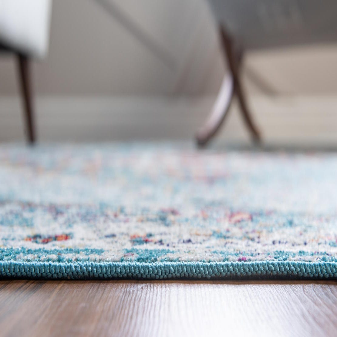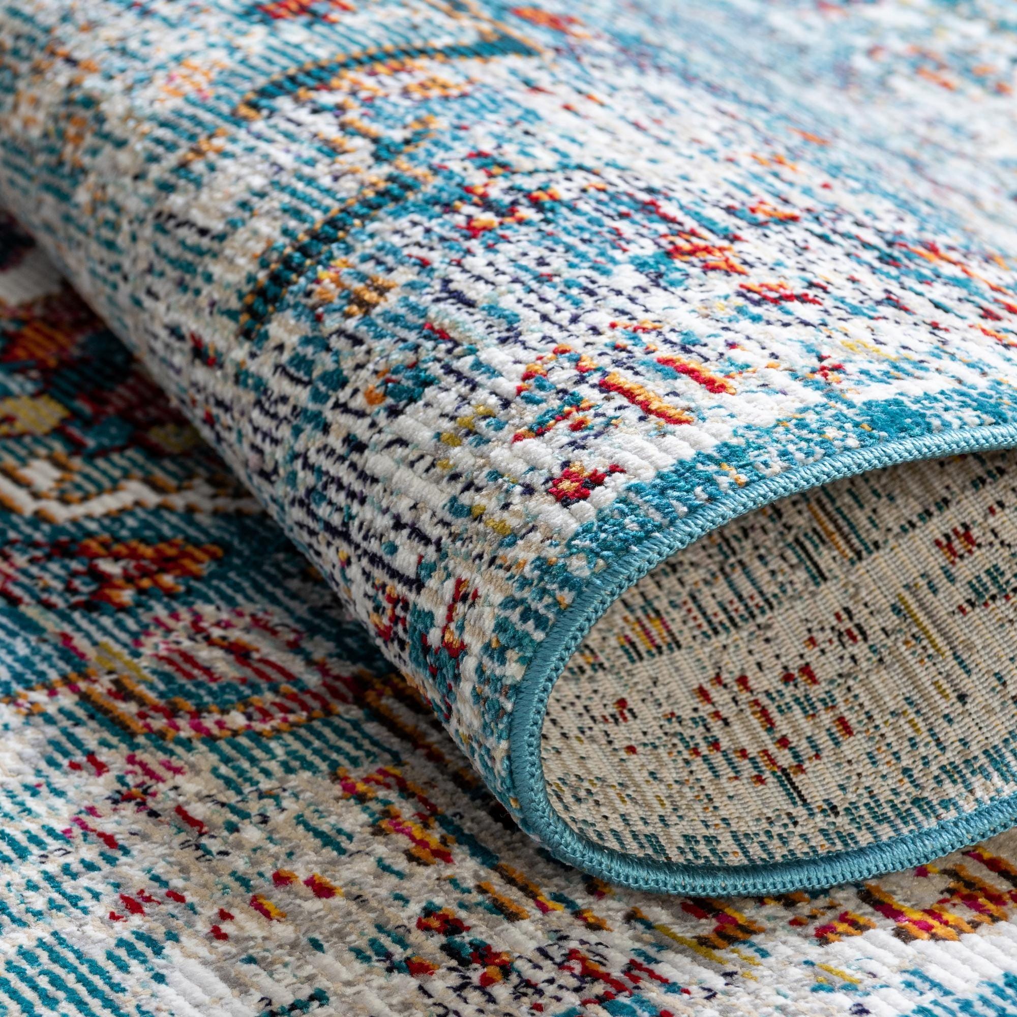 A bright turquoise field sets the stage for a classic medallion layout with a modern, worn-in look. An ivory-centered medallion anchors layered floral and geometric motifs in shades of red, orange, blue, brown and green, while gray and yellow accents add depth. The outer band reads as a faded ivory border dotted with small floral sprigs in orange and red, giving the rug a timeworn, vintage character. Running your hand across the surface reveals a low-profile pile with a subtle textured finish that holds the color variations and fine pattern details.