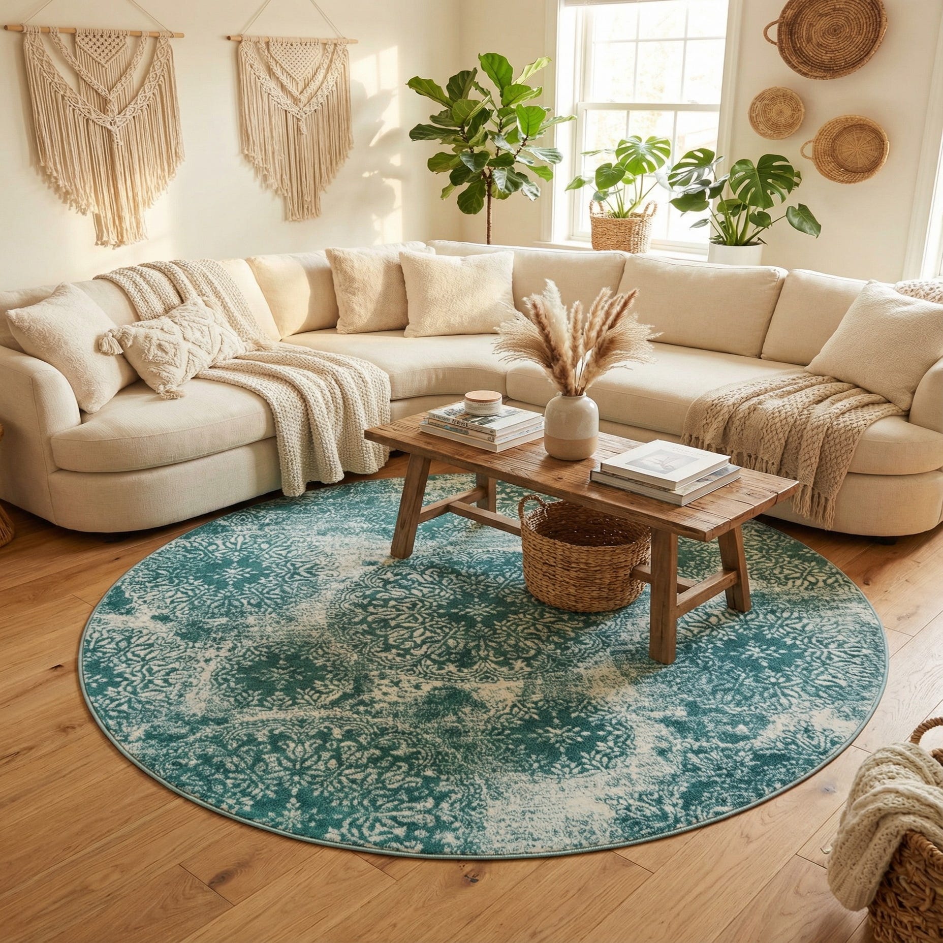 Primary color is Turquoise. Colors in this rug include: Turquoise, Ivory.