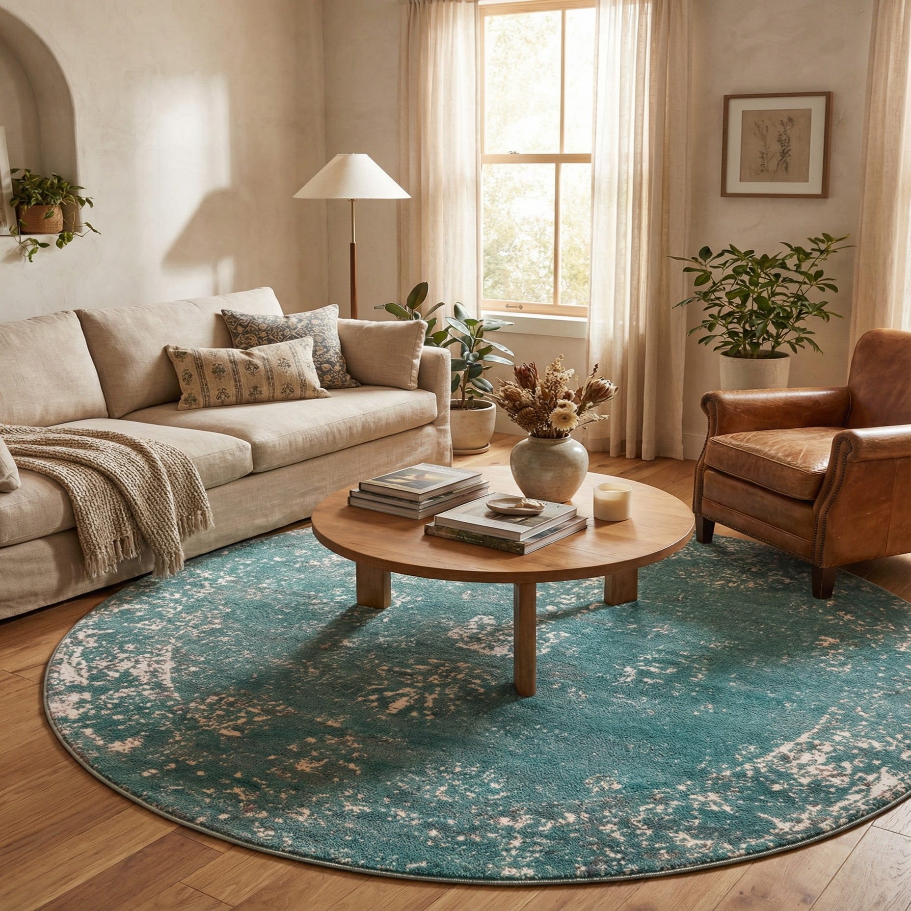 This rug would complement modern and transitional interiors perfectly, bringing a touch of color and sophistication to living rooms, bedrooms, and dining areas. Its round shape and significant size make it an excellent focal point in a sitting area or under a round dining table, and it coordinates well with neutral and wood tones, metallic finishes, and other turquoise accents for a cohesive aesthetic.