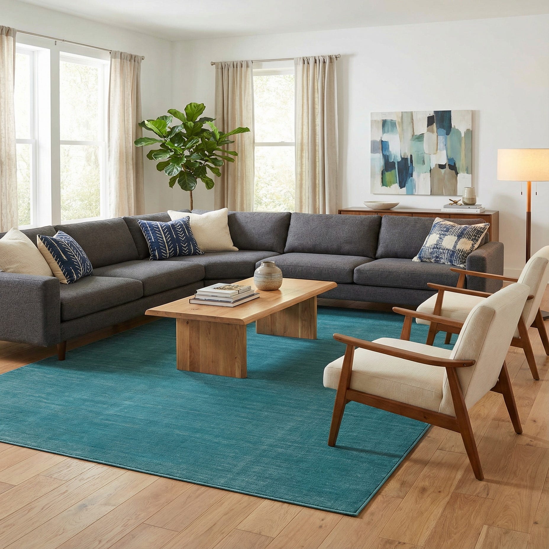 This rug works well where you want a strong pop of color without competing patterns — place it beneath a neutral sofa in a contemporary living room, anchor a mid-century seating group with warm wood tones, or add a cool contrast in a coastal-inspired bedroom. Its low profile also makes it a good choice under dining chairs or in a home office, and it layers nicely over a natural-fiber runner to introduce color and softness to a hallway or entry.