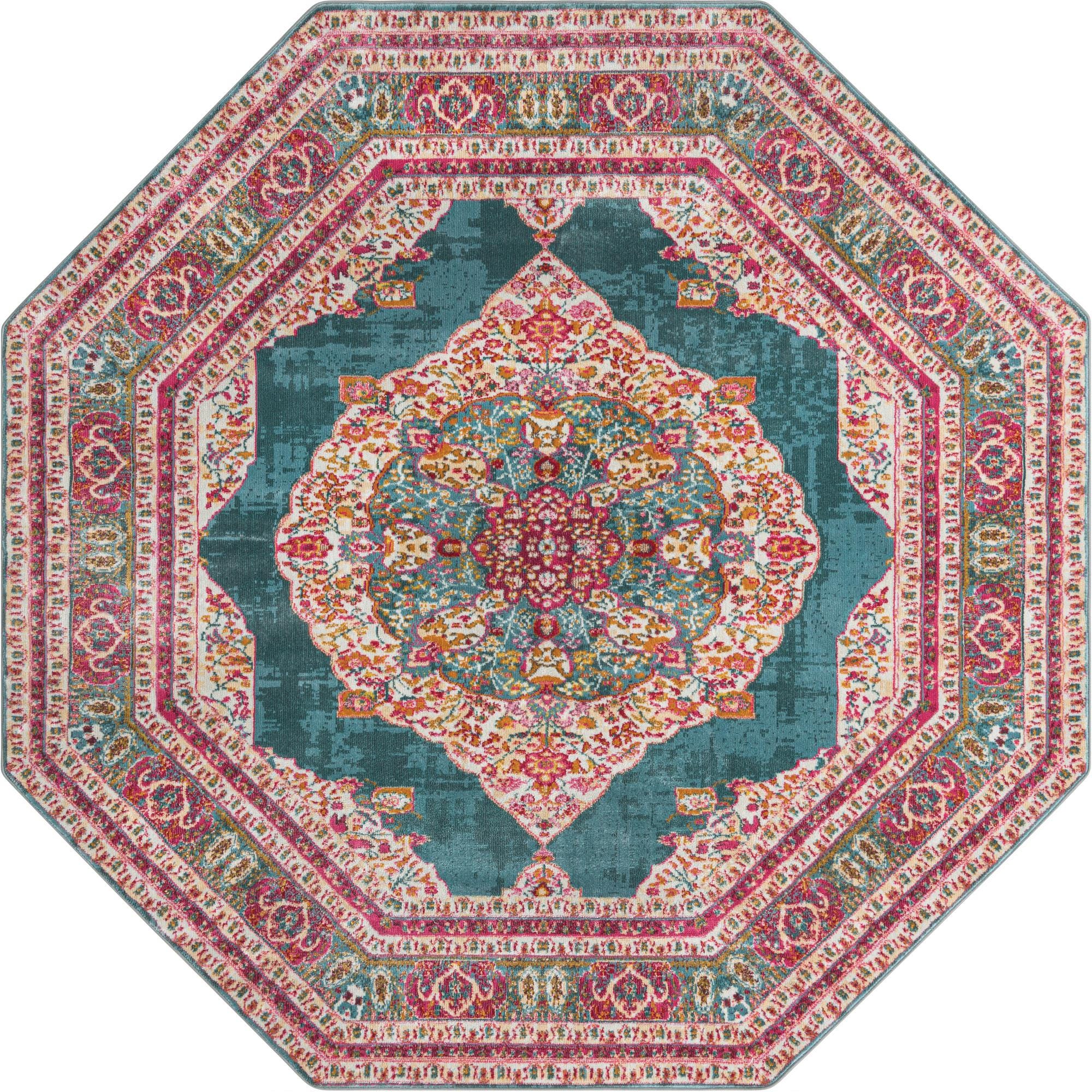 A bold medallion anchors this octagonal area rug, set against a turquoise ground that brings immediate depth to the pattern. Layers of ornate borders in ivory, pink, red, violet and olive frame the center, while accents of orange and gold add warmth and contrast. The overall look blends traditional Persian-inspired motifs with a slightly distressed finish for a lived-in, vintage aesthetic.