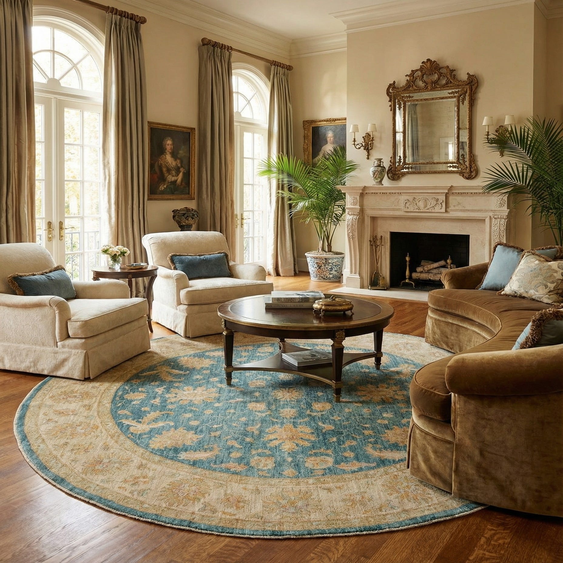 A round 8' 2 x 8' 3 Kaizar Persian rug with a blue center and a beige border, featuring intricate floral patterns.