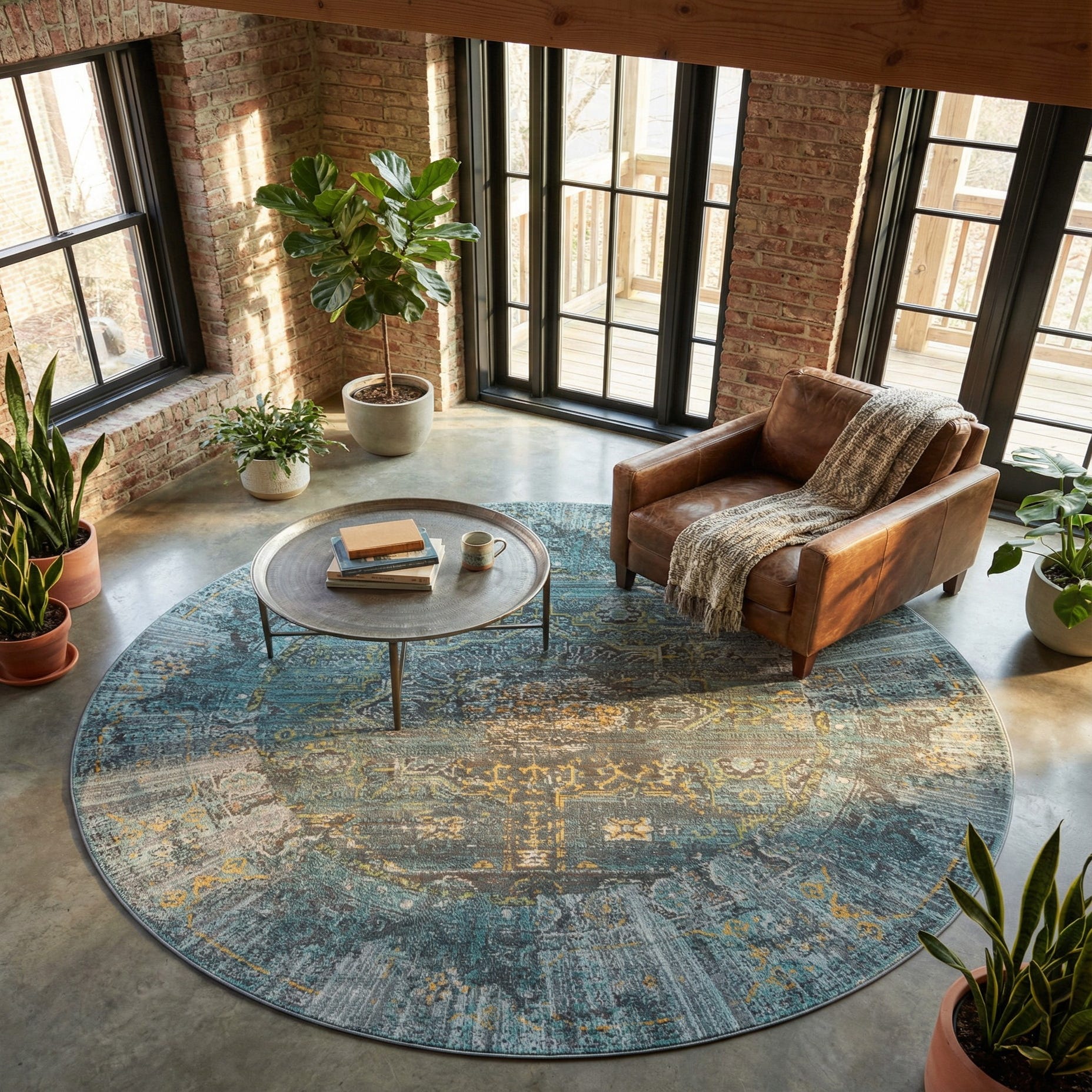 Machine-made from 100% polypropylene, the rug has a low, slightly dense pile that feels smooth underfoot while still offering subtle texture where the pattern is raised. Its round shape works well beneath a circular dining table, as an anchor for a conversational seating group, or centered in a bedroom to introduce color and pattern. Pair it with warm wood furniture and brass accents to pick up the gold tones, or layer it over neutral flooring with ivory and gray furnishings for a balanced, transitional look.