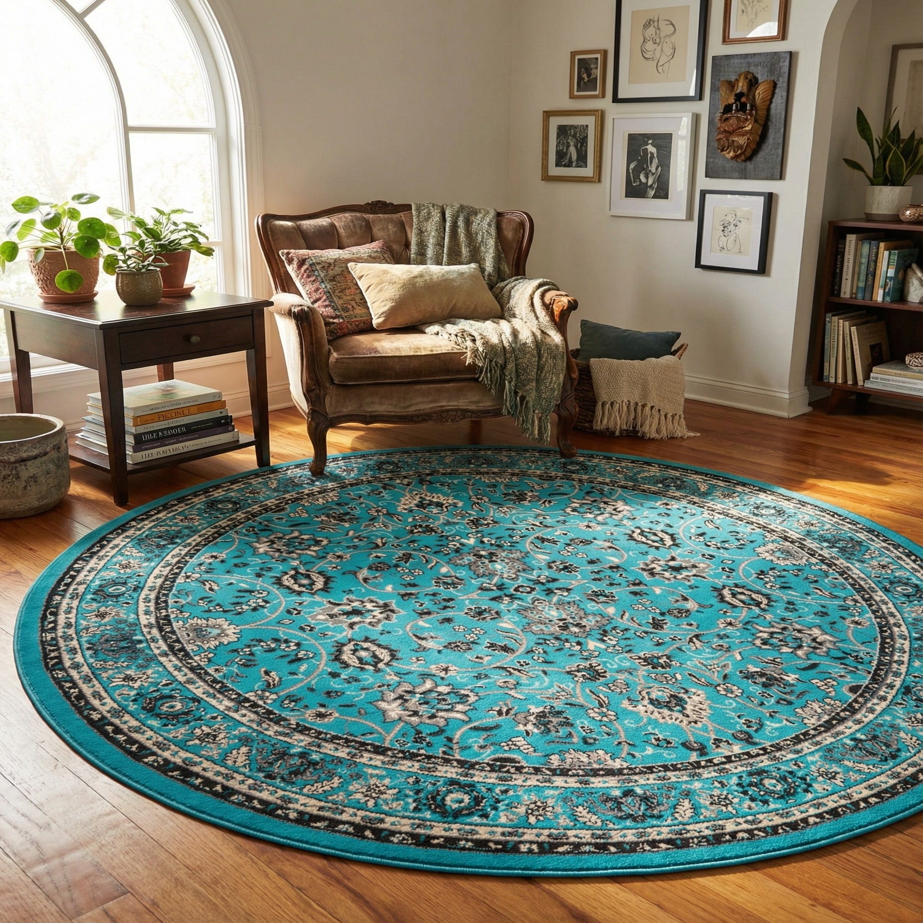 This round piece works well under a circular dining table or as the focal point in a seating area, where the vibrant turquoise can enliven neutral furnishings. Pair it with light wood and rattan for a coastal-inspired room, combine it with layered textiles and mixed patterns for an eclectic or bohemian scheme, or let it provide a lively accent against mid-century modern sofas and clean-lined furniture. It also fits nicely in entryways or bedrooms when you want a traditional pattern rendered in a contemporary color palette.