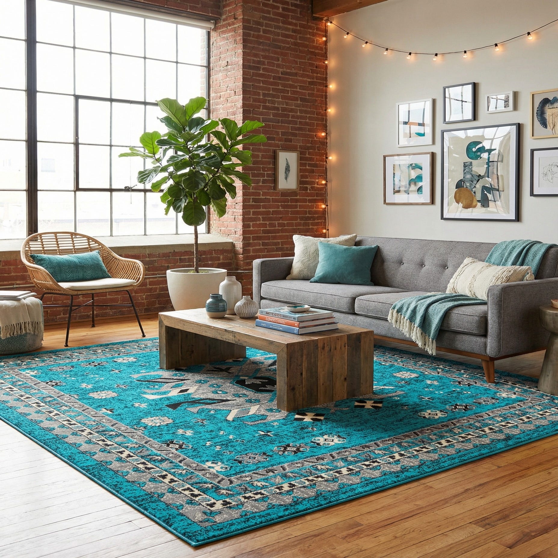 This rug pairs well with coastal, transitional, or modern-bohemian spaces — think light-wood furniture, linen or cream upholstery, and black metal accents for contrast. Use it to anchor a seating area, place beneath a dining table to add color and pattern, or position at the foot of a bed to warm a neutral bedroom palette. The bold turquoise background offers a strong focal point while the muted gray, cream and black accents make it easy to coordinate with a variety of decor schemes.