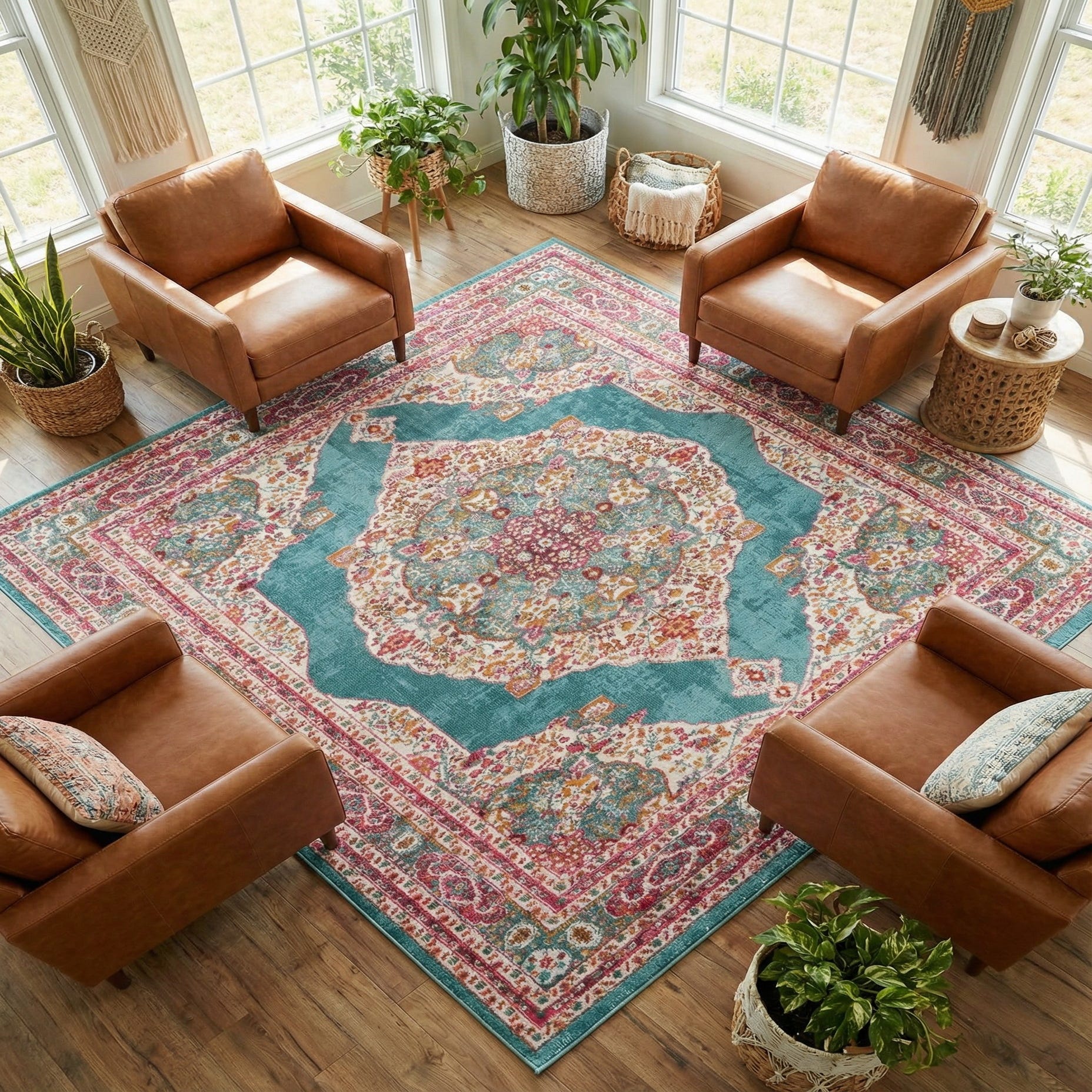 This piece works well as a focal point in a living room or seating area where color and pattern are welcome, or under a dining table to introduce lively contrast against wood tones. It also fits eclectic, bohemian, or modern-traditional schemes — pair it with warm woods, rattan pieces, or neutral upholstery to balance the palette, or layer it over a larger natural-fiber rug to add pattern and color without overwhelming the room.