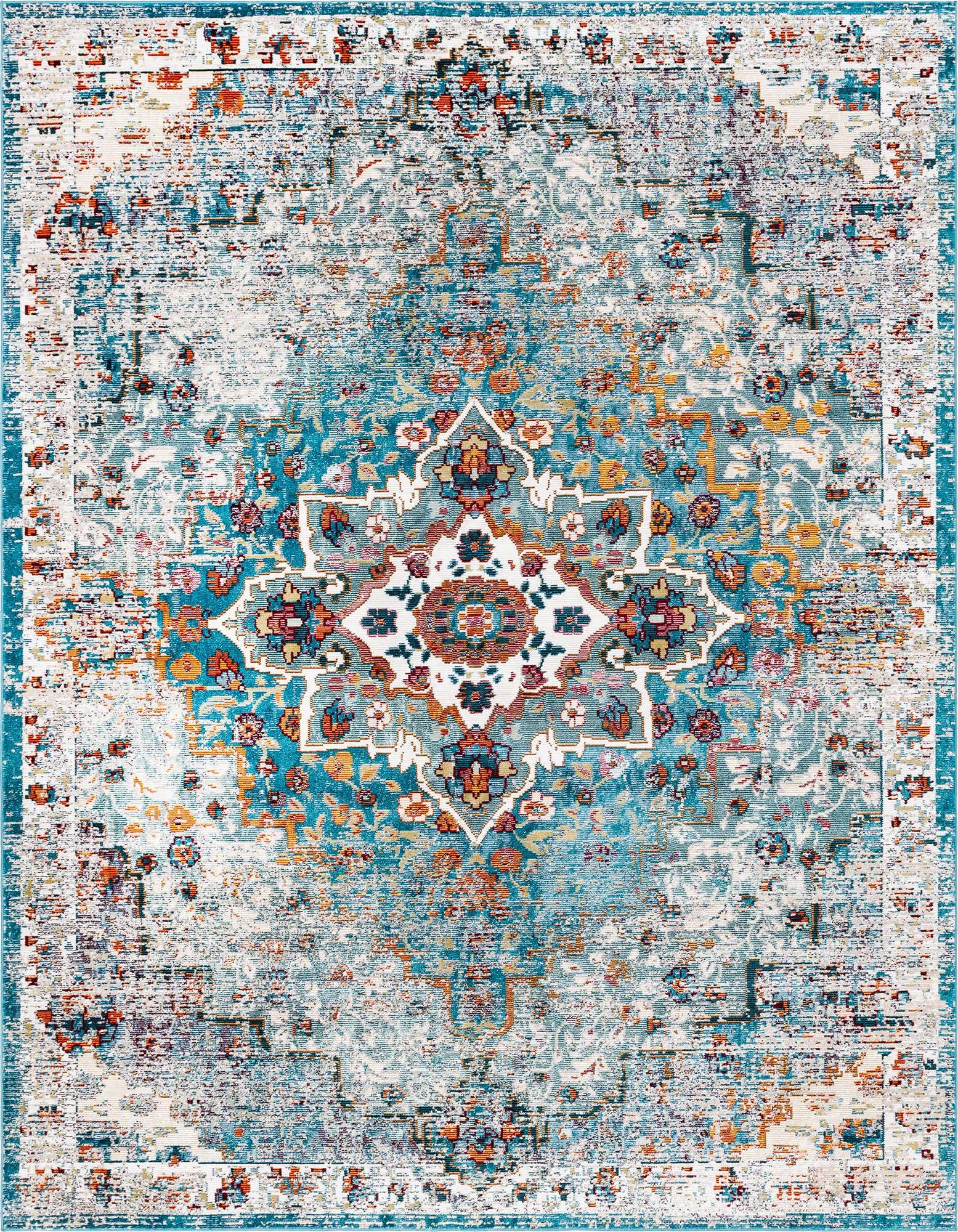 The Amulet Collection rug presents a harmonious fusion of traditional design elements and a vibrant color palette, creating a visually stunning statement for any room. This 8x10 area rug boasts a rich turquoise background, complemented by an array of accent colors including black, blue, brown, gray, green, ivory, orange, red, and yellow. Its intricate pattern, featuring a central medallion surrounded by ornate details, draws inspiration from classic oriental motifs, while adding a modern twist through the use of contemporary hues.