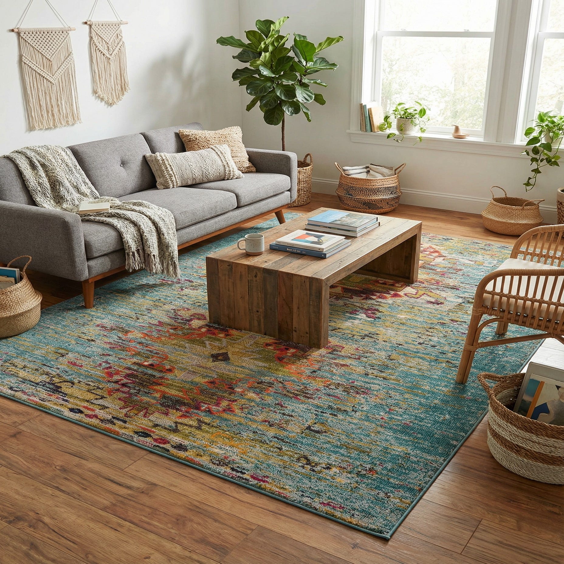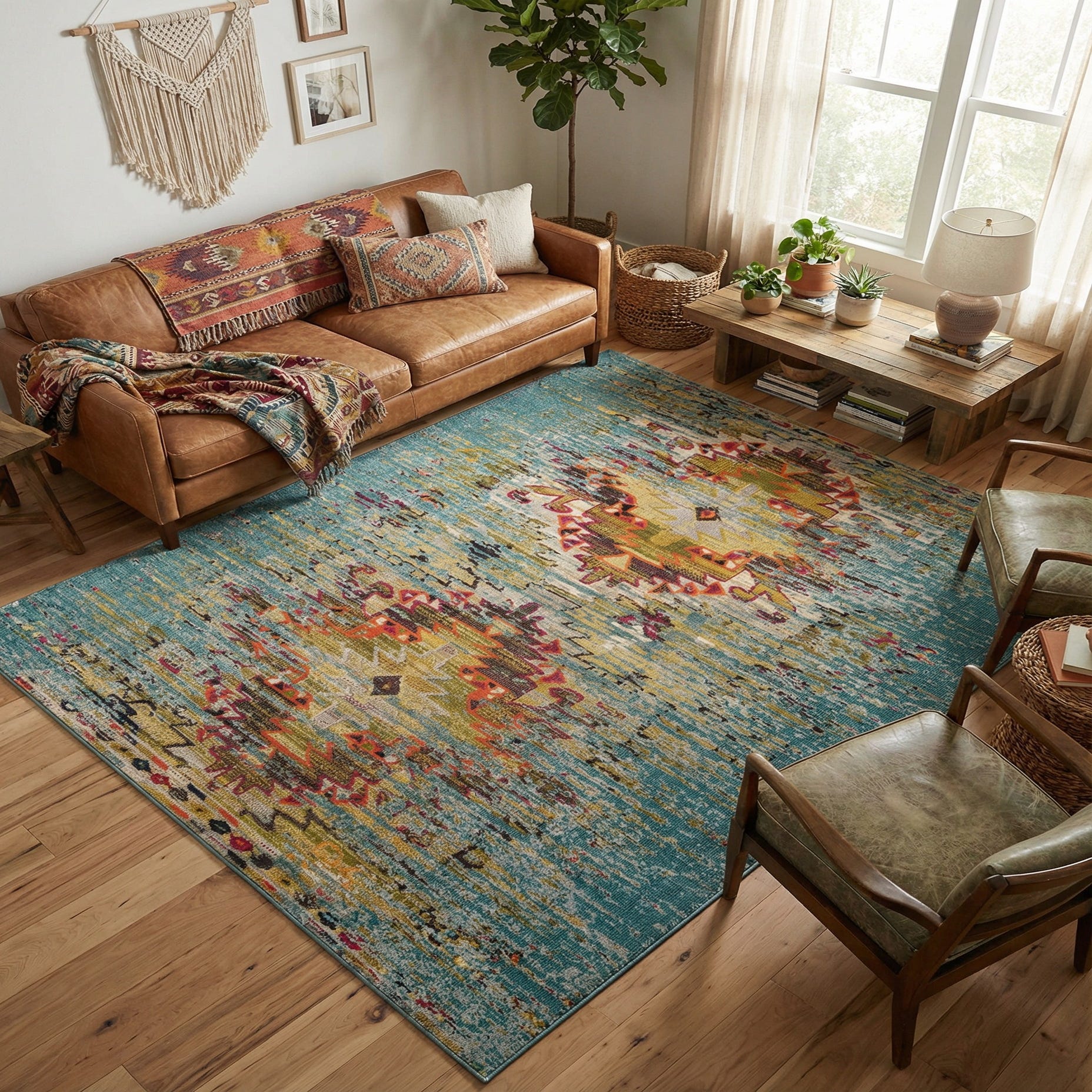 Place this rug beneath a neutral sofa to introduce color without overpowering the room, or layer it in a bohemian or southwestern-inspired space with natural wood and mixed textiles. It also pairs well with coastal or eclectic decor—think weathered furniture and woven accents—or as a statement layer in a creative home office or dining area to add warmth and visual interest.