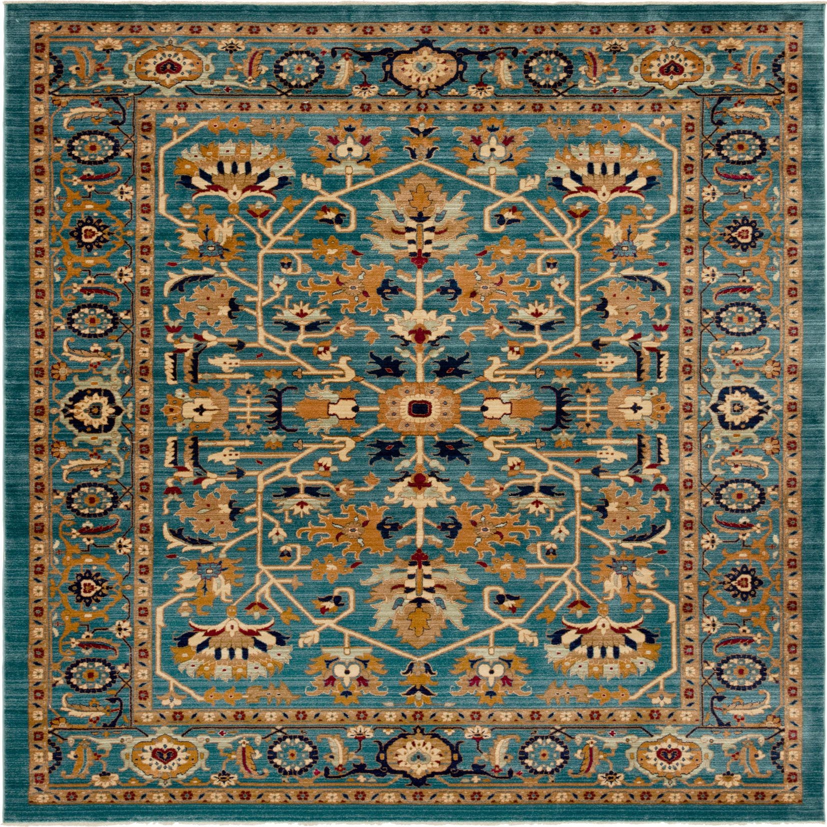 Primary color is Turquoise. Colors in this rug include: Turquoise, Navy Blue, Orange, Red, Ivory, Light Blue.
