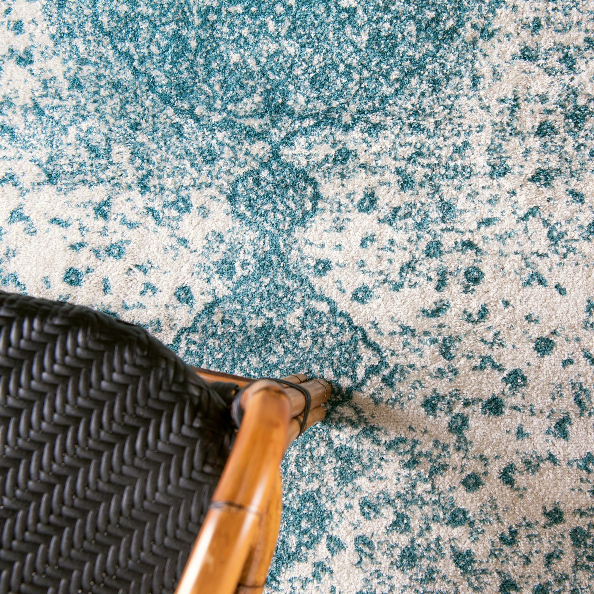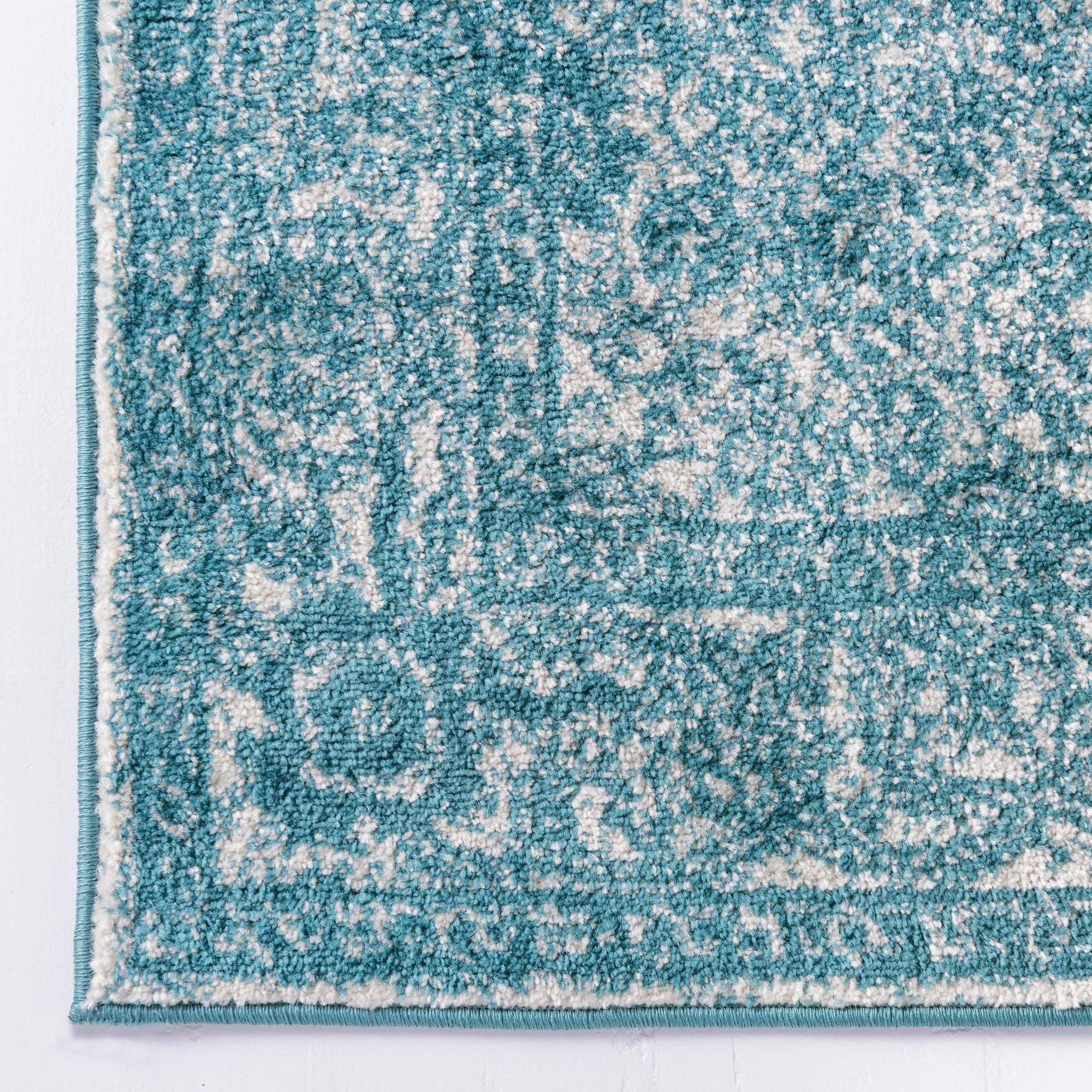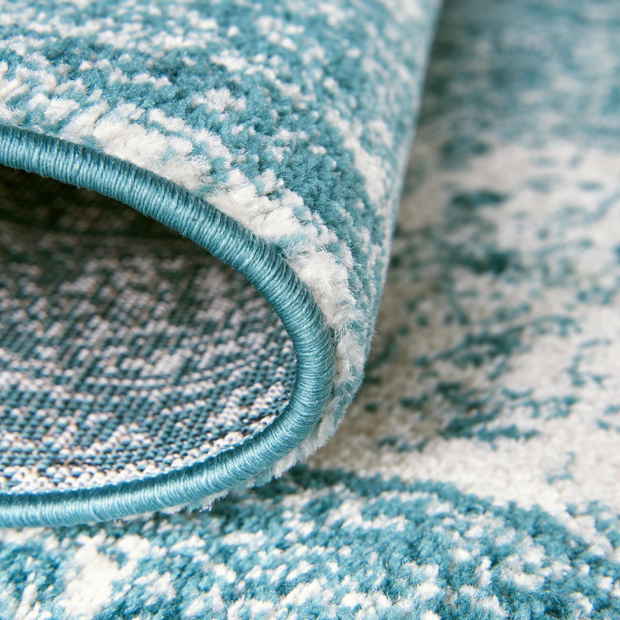 Primary color is Turquoise. Colors in this rug include: Turquoise, Ivory.