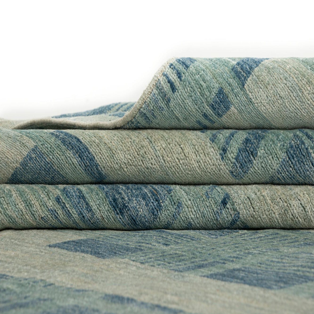 The rug's square and rectangular block motifs provide a structured aesthetic that can anchor a room with a contemporary or modern feel, while its woolen texture adds an element of warmth and comfort. The varied shades of turquoise and blue intermixed with beige allow for versatile color coordination in a variety of settings.