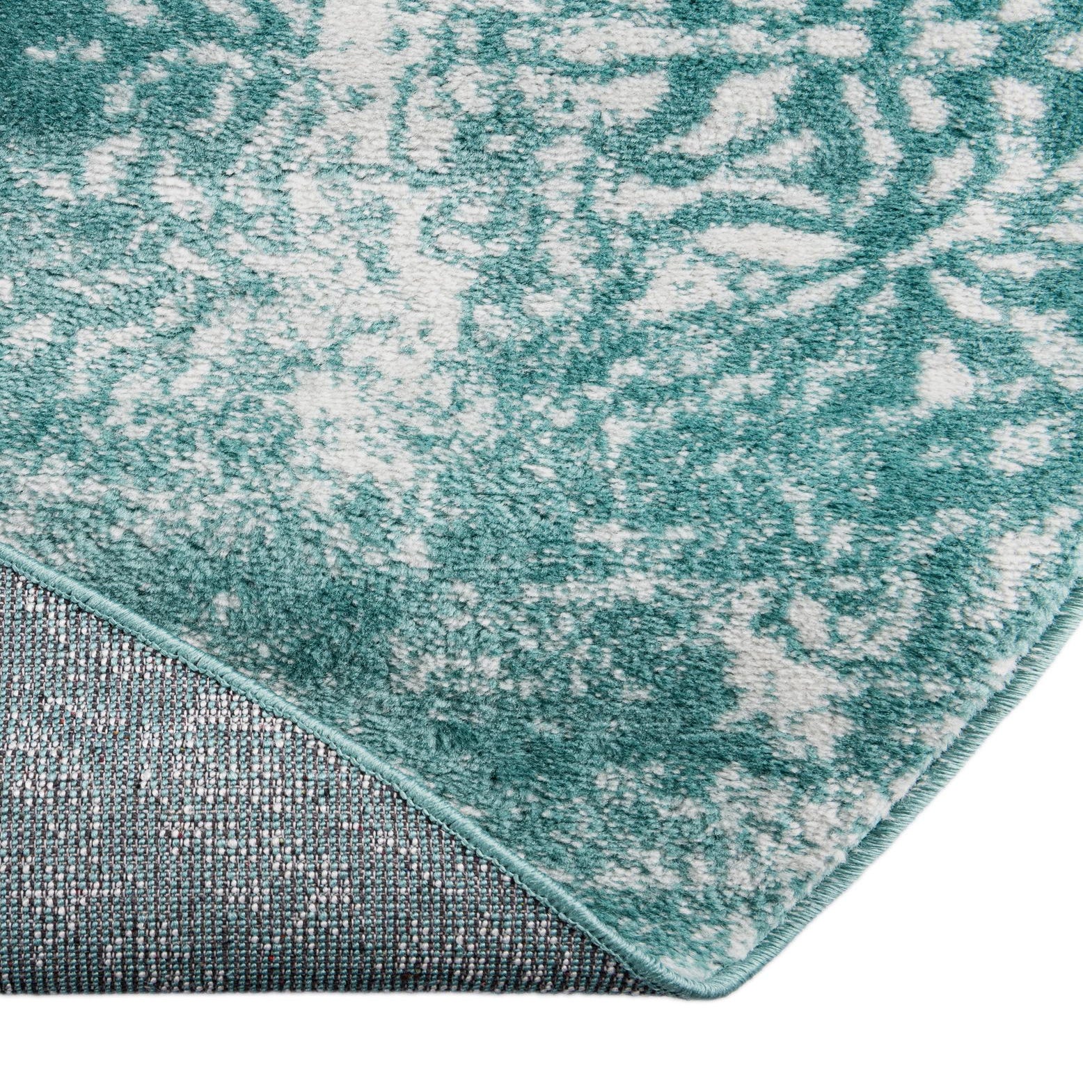 Primary color is Turquoise. Colors in this rug include: Turquoise, Ivory.