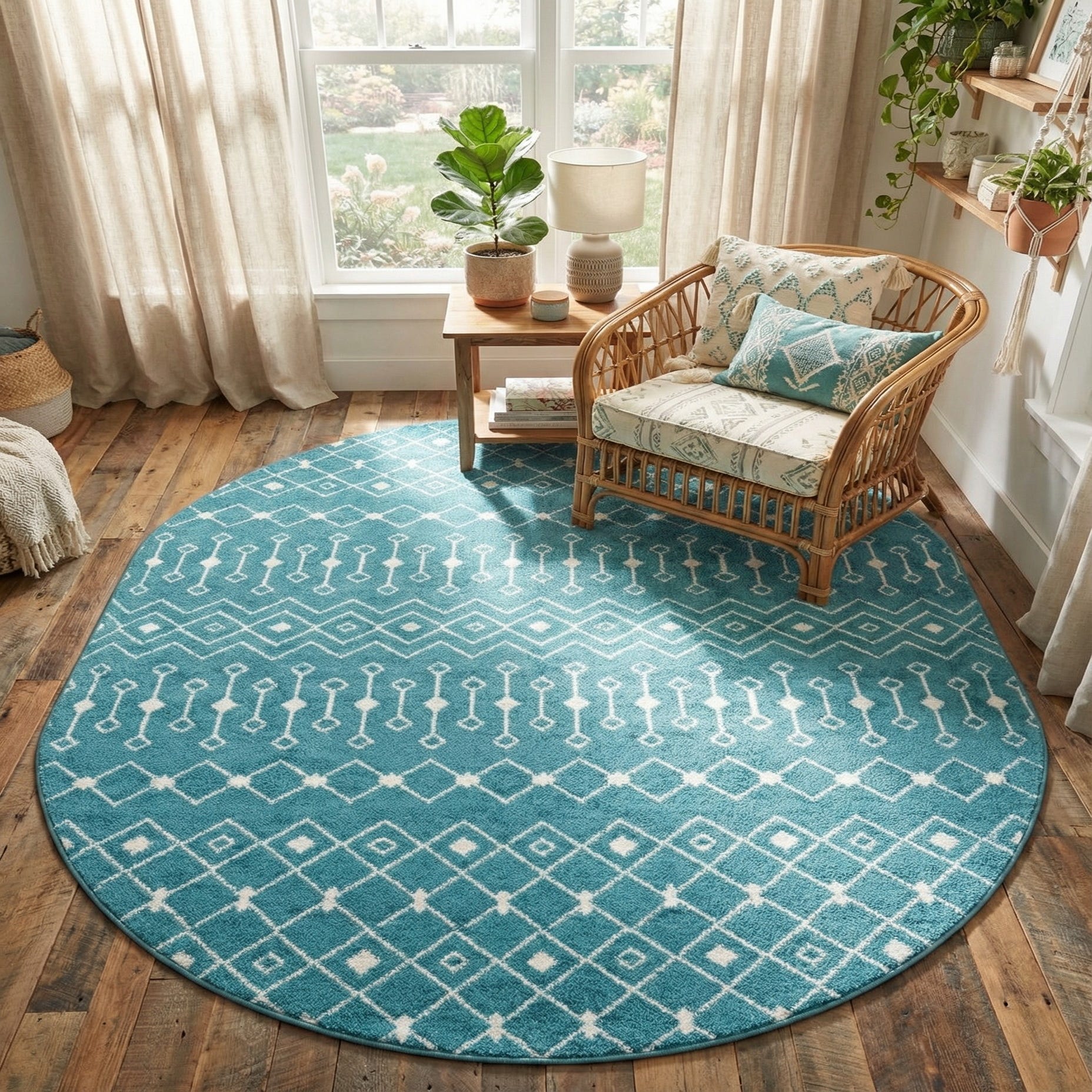 This piece works well in coastal, contemporary, bohemian or cottage-inspired rooms. The oval shape naturally softens angular furniture, making it a good anchor for a seating area, a round dining nook, or a hallway that needs a pop of color. Pair it with light wood tones, crisp white accents, or woven textiles to highlight the turquoise and ivory palette.