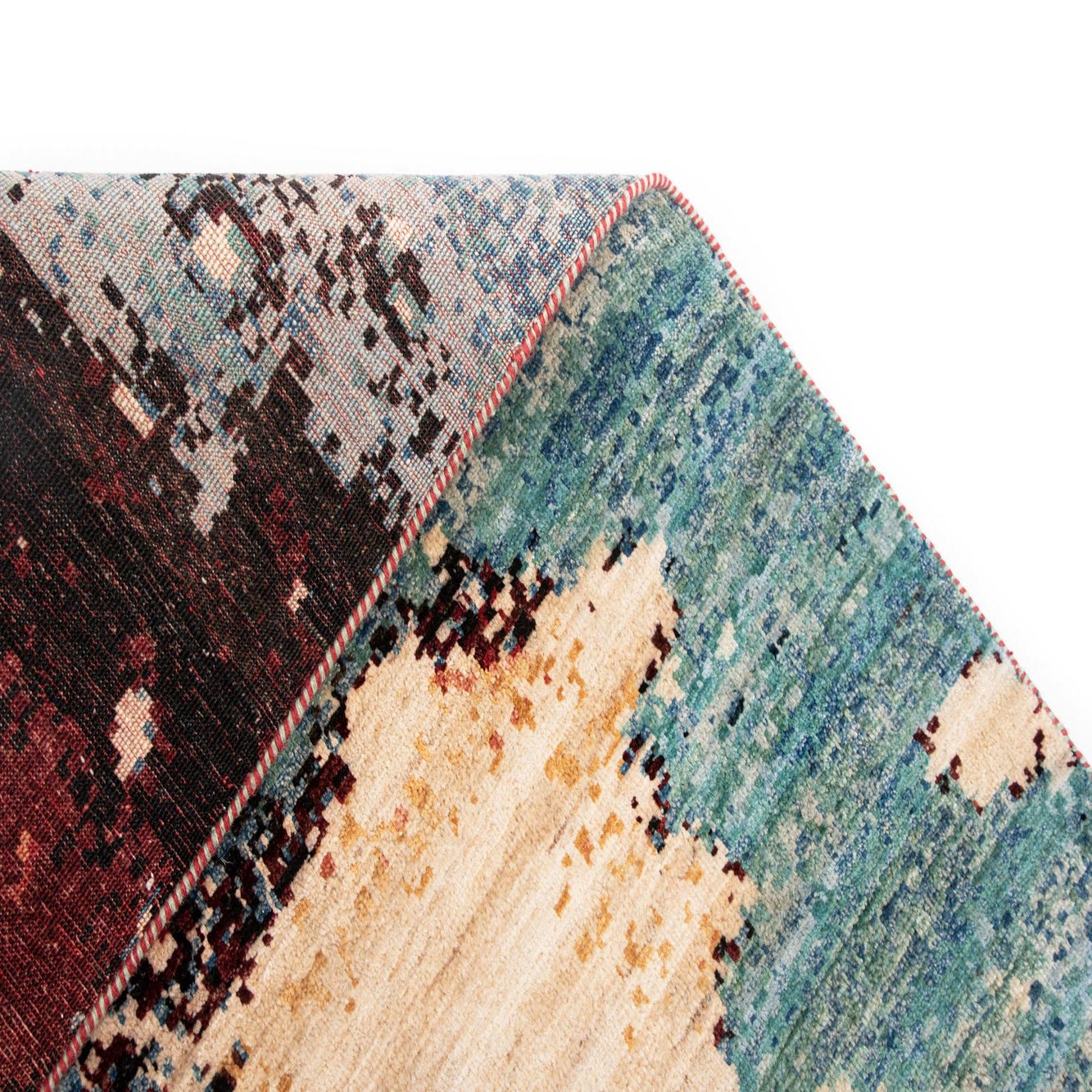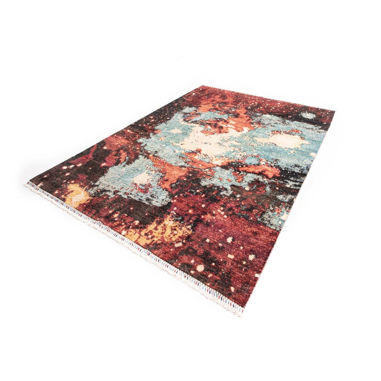 The Rubin collection features a hand-made rug, crafted from 100% wool, offering durability alongside a soft and inviting texture. This 8x10 piece displays a bold and artistic pattern with a dominant turquoise background accompanied by splashes of red, beige, yellow, and orange, creating a captivating and contemporary visual appeal. The abstract design suggests versatility, making it suitable for various interior design themes ranging from modern to bohemian.