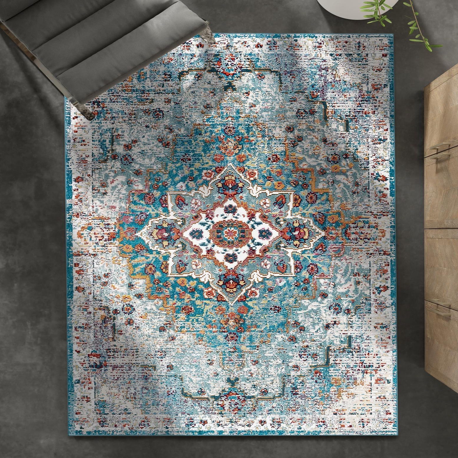 A bright turquoise field anchors a traditional medallion motif softened by a distressed, vintage-inspired finish. The design layers floral and arabesque elements in a classic Persian layout, with an ivory-centered medallion framed by accents in blue, teal, green, brown, red, orange, yellow and touches of black and gray. The outer border and background carry that intentionally worn look, blending colorful details into a faded ground for a lived-in, layered effect.