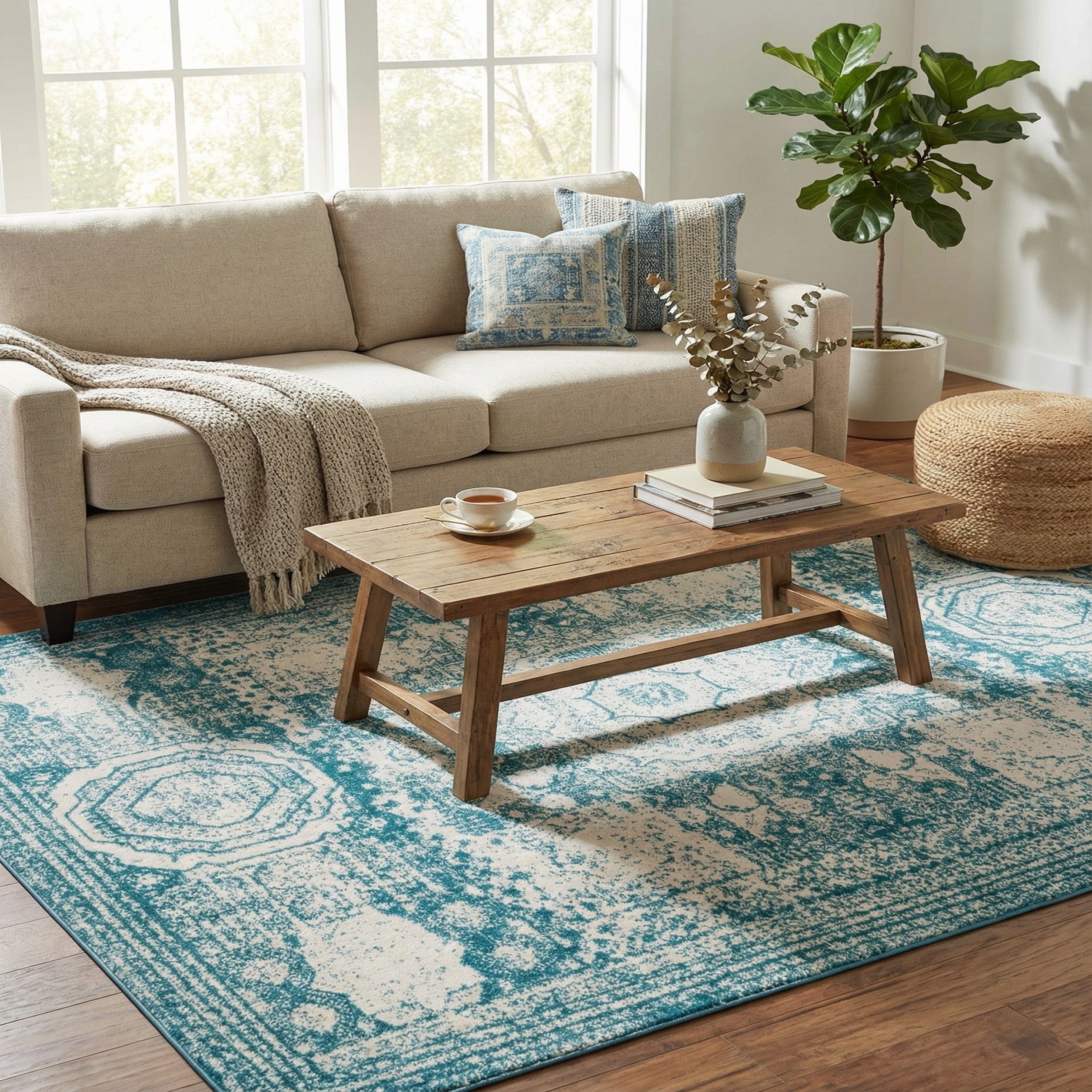 The turquoise background brings a clear, fresh pop of color that pairs naturally with light woods, wicker, and neutral upholstery. Use it to anchor a living room seating area, beneath a bed to introduce color and pattern, or under a dining table to add personality without distraction. Its transitional aesthetic works well in coastal, modern farmhouse, or contemporary eclectic interiors where a hint of vintage character and a cool color palette are desired.