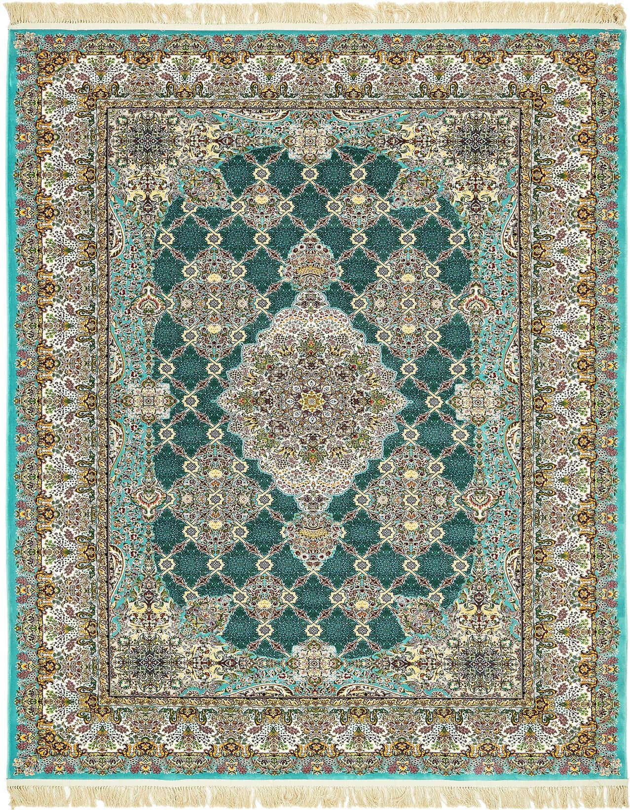 Primary color is Turquoise. Colors in this rug include: Turquoise, Gold, Green, Ivory, Navy Blue, Orange, Puce, Red.