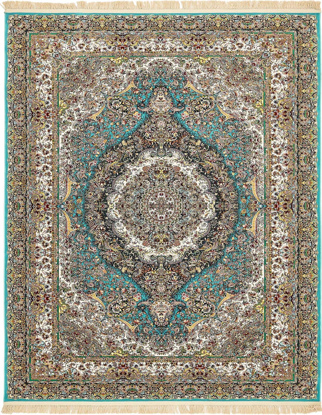 Primary color is Turquoise. Colors in this rug include: Turquoise, Green, Ivory, Olive, Orange, Yellow, Red, Navy Blue, Brown.