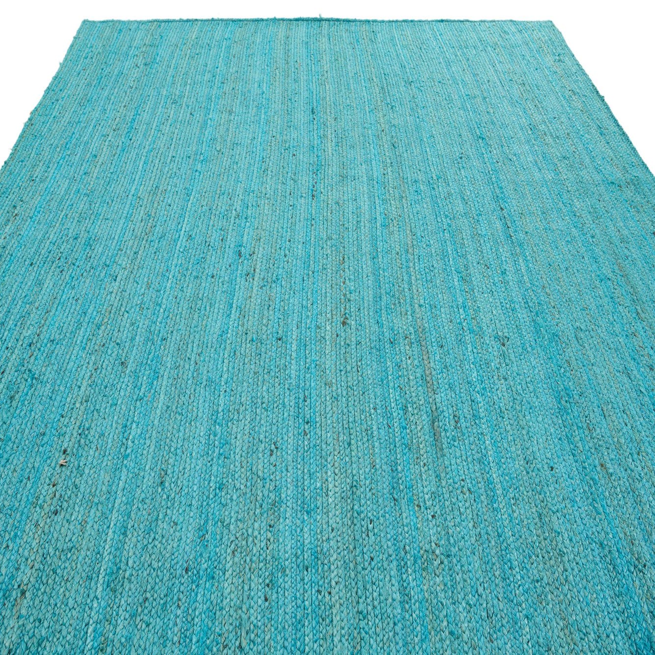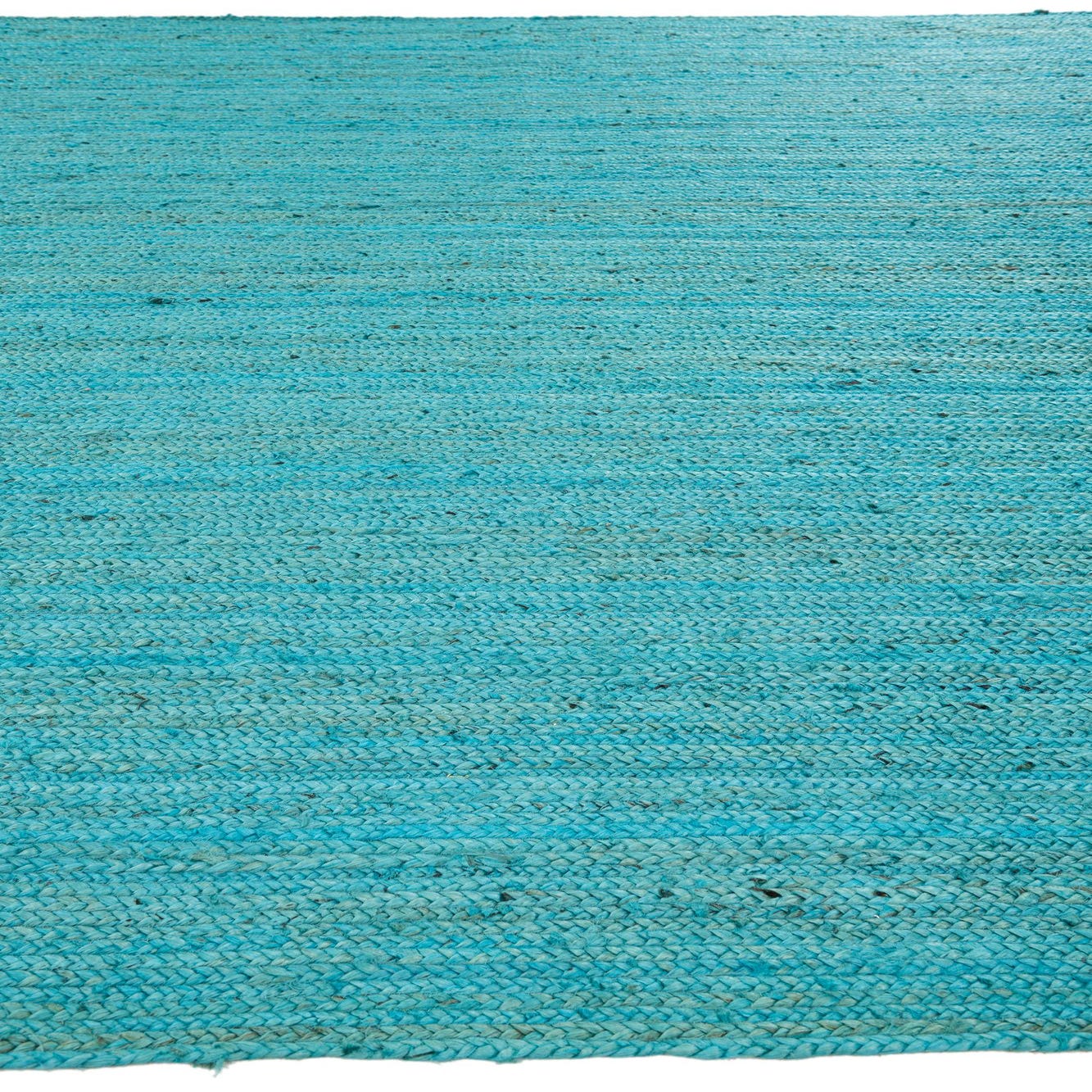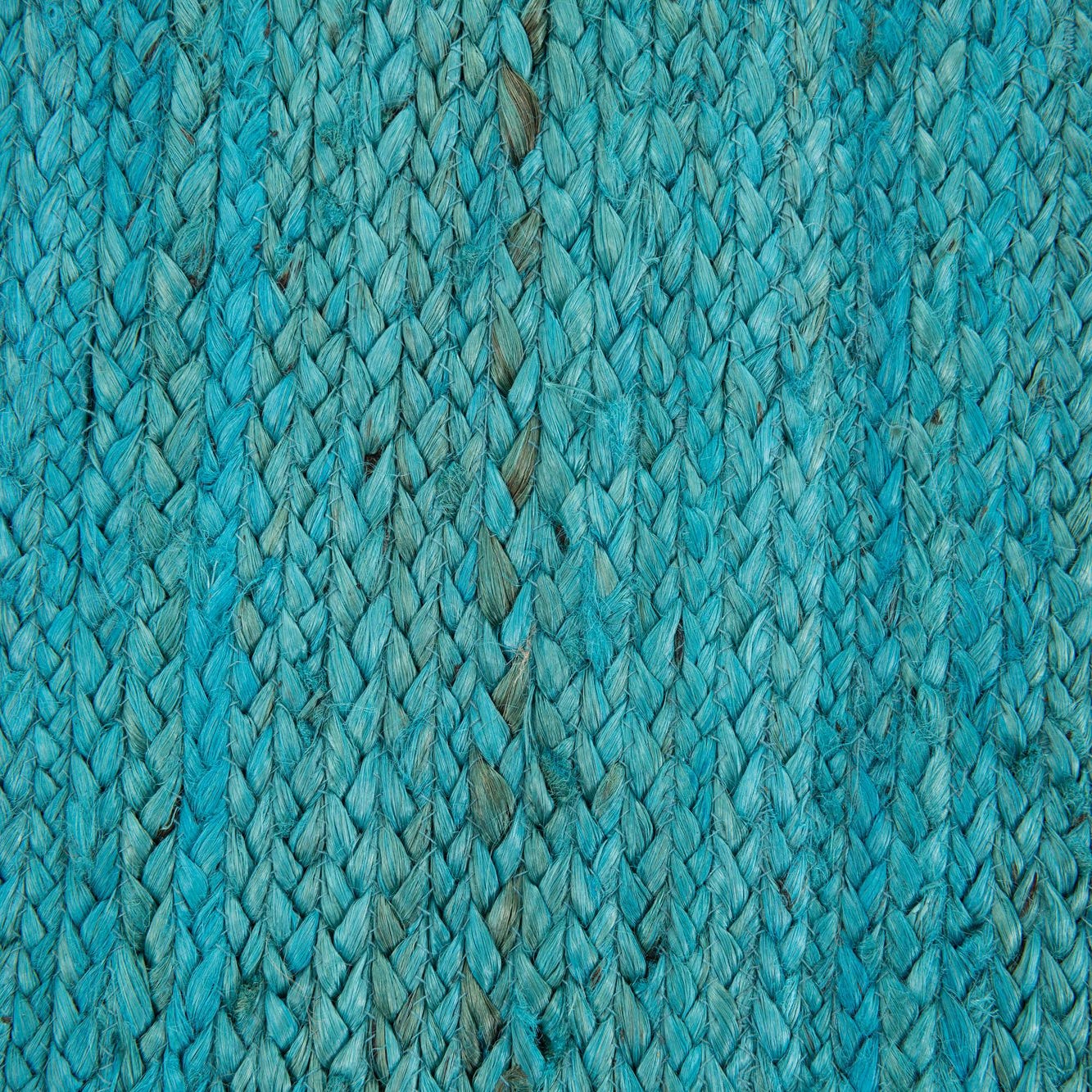 Hand-braided from 100% jute, this rug presents a clean, linear braided pattern in a vibrant turquoise ground threaded with natural fiber flecks. The braided construction creates subtle ribbing across the surface that reads as restrained texture rather than heavy pile; it has a low-profile, tactile feel that adds warmth without bulk. The turquoise tone brings a fresh, coastal energy while the natural jute accents keep the look grounded and organic.