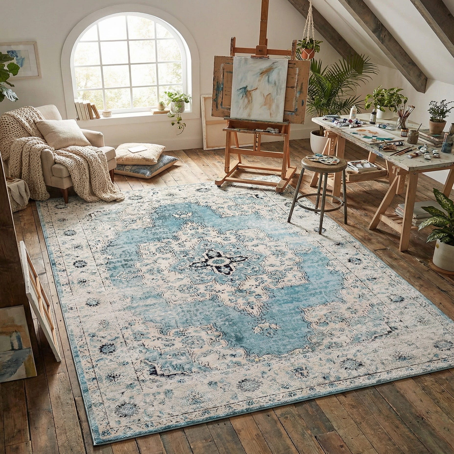 A softly distressed medallion rug with a vintage-inspired pattern, this machine-made piece presents a central ornate medallion and subtle corner spandrels set against a turquoise field. Cream and beige motifs layer over teal and navy blue accents, giving the design depth and a gently aged look. The low-profile pile, woven from 100% polypropylene, feels smooth underfoot and lays flat beneath furniture while maintaining clear pattern definition.