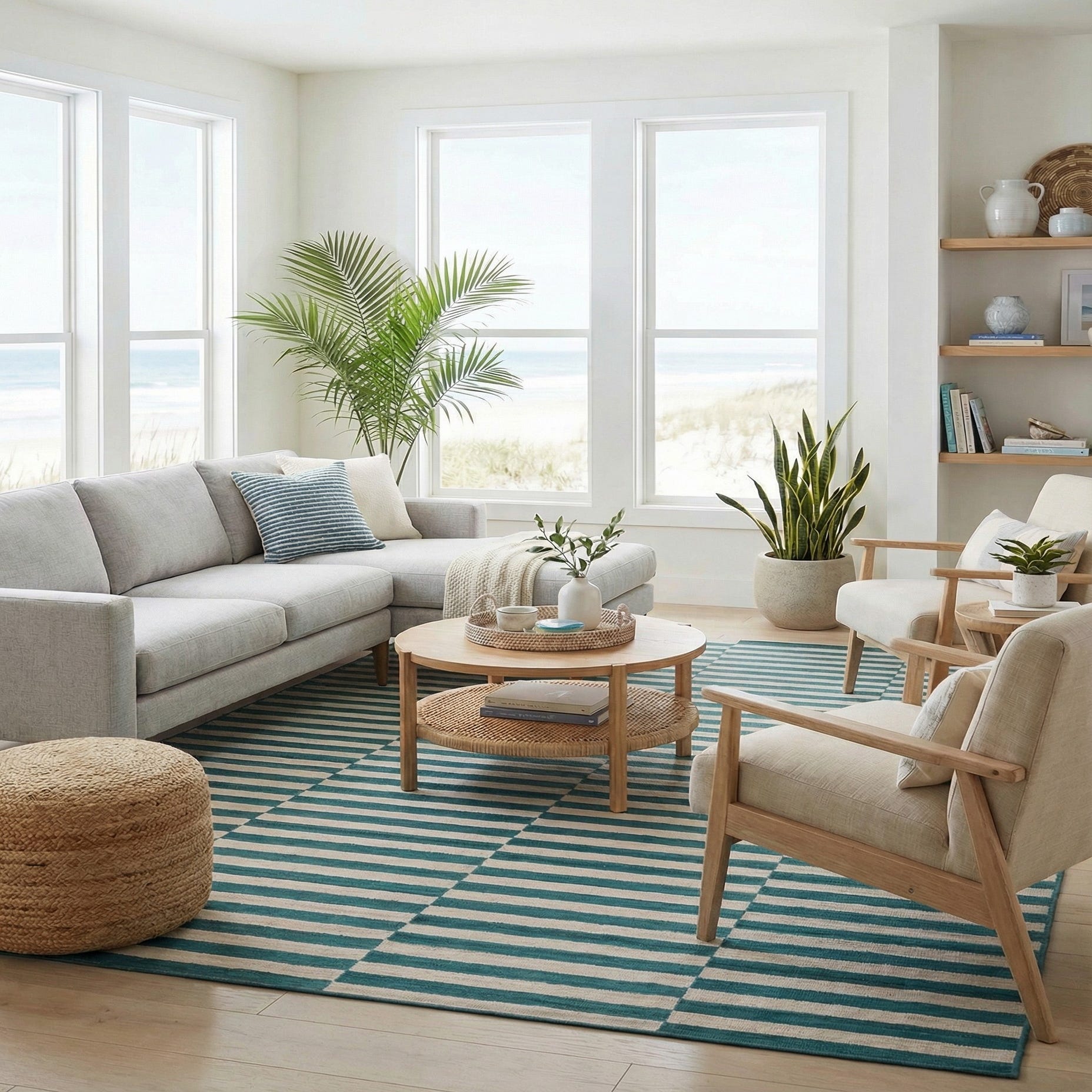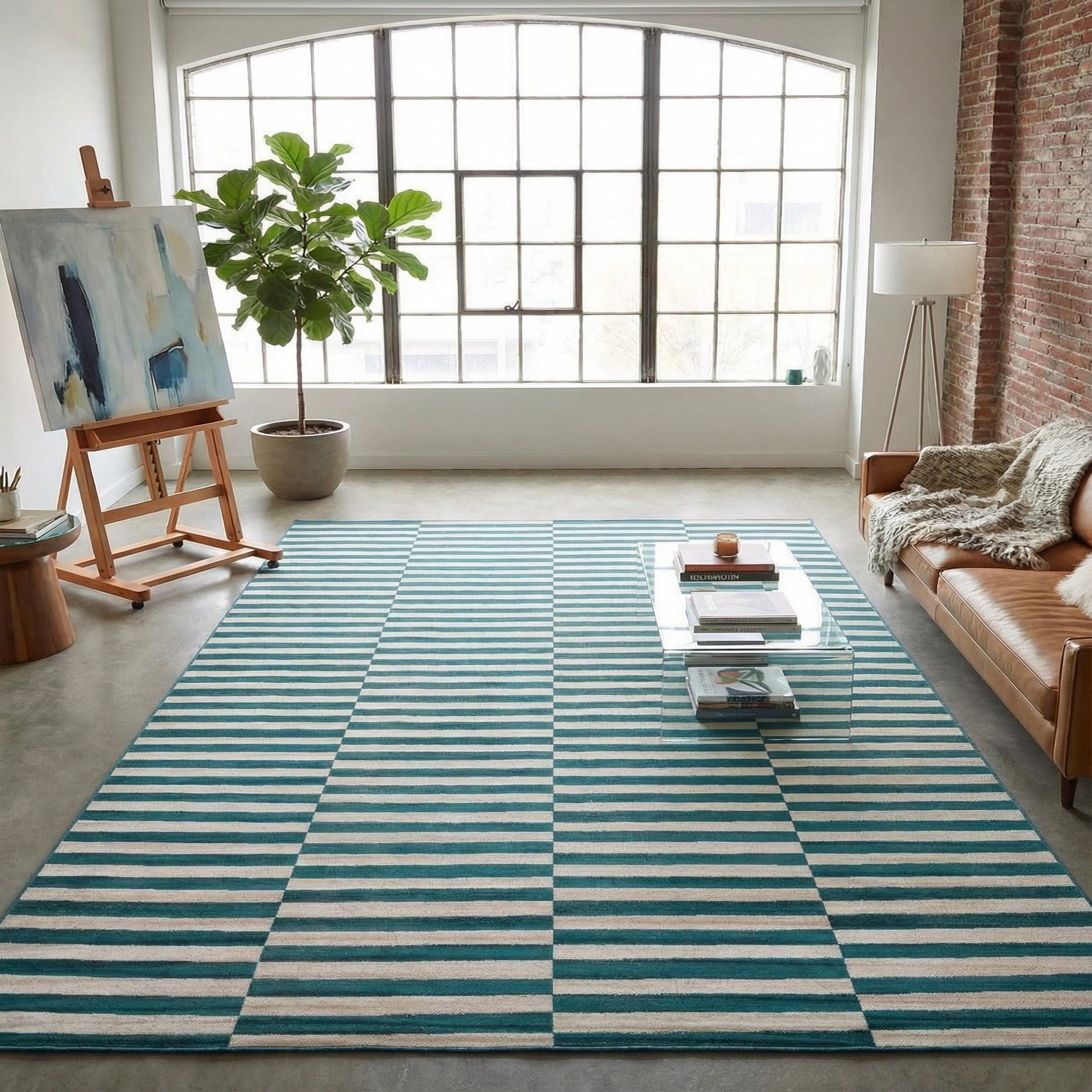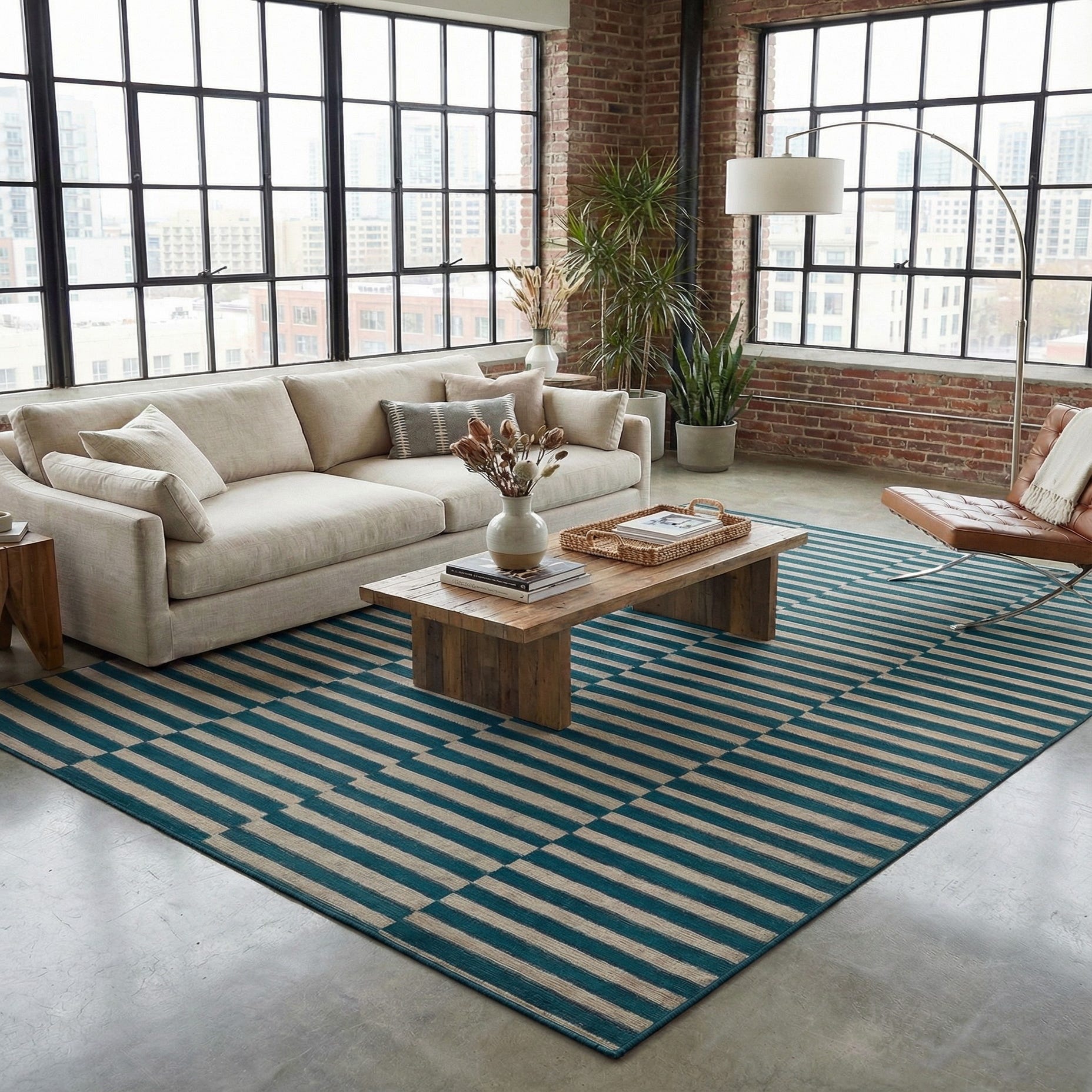 We bought 2 of these - one fr our living room and one for the kitchen - since the rooms are open and have the same color scheme. Pay attention to the pile height - it is pretty flat and not as plush as the other low pile rugs we ordered. And because of that it is taking a while to lay completely flat. The larger size flattened out quicker than the smaller size and we can still see some ripples and the corners still stick up. Color is gorgeous though (we got the teal) and size is accurate.