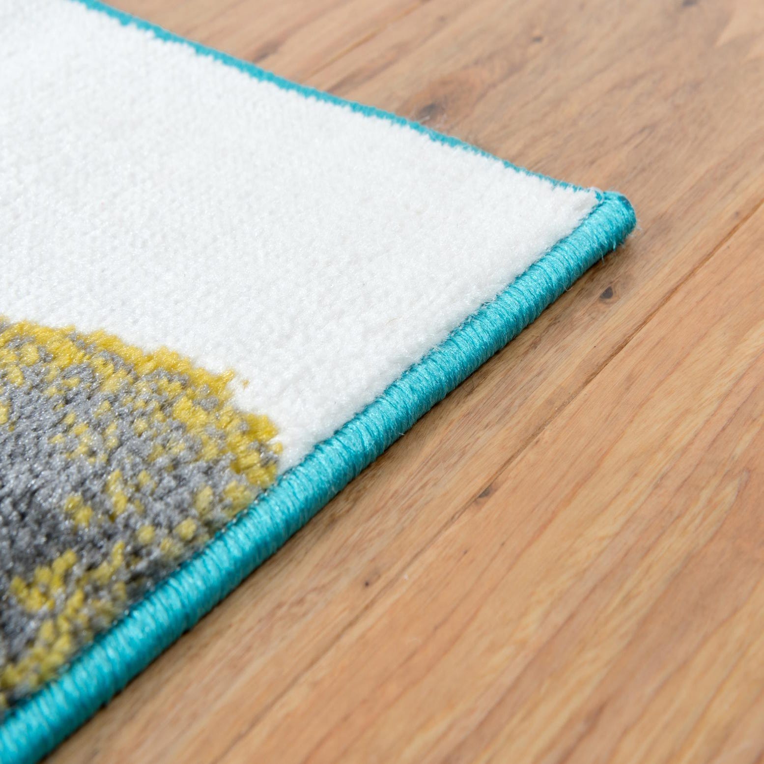 Primary color is Turquoise. Colors in this rug include: Turquoise, Black, Gray, Yellow, Ivory.