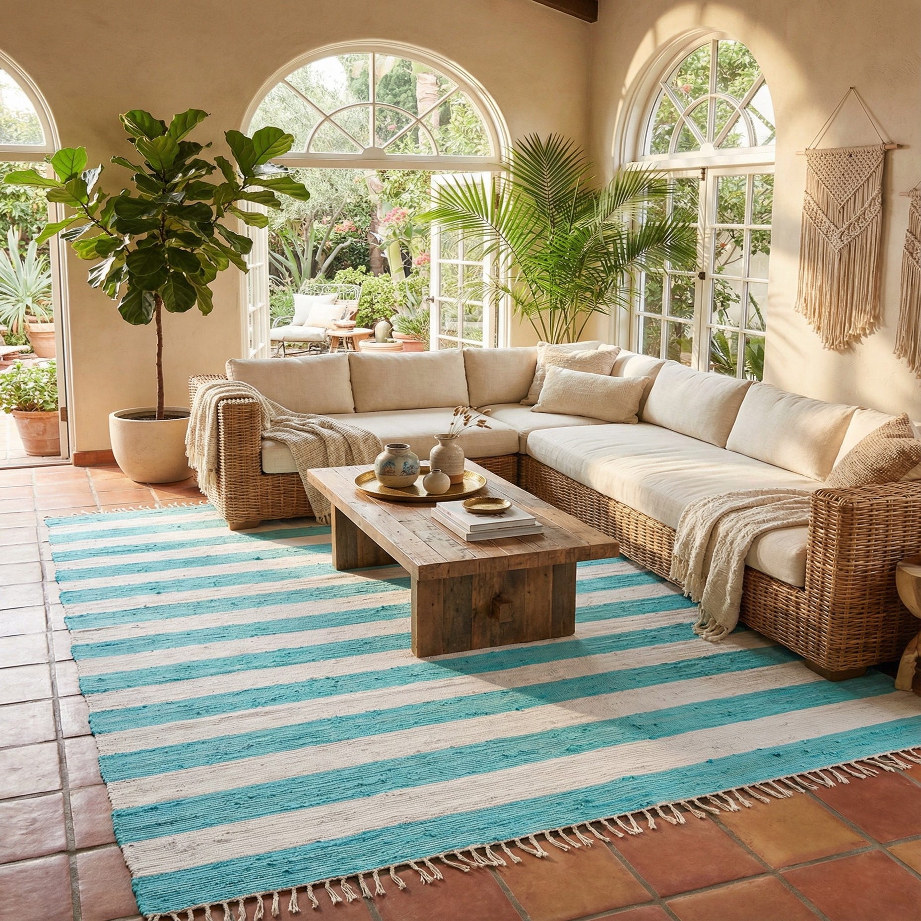 The clean stripe pattern and coastal colorway work well in casual, contemporary, or coastal-inspired interiors. Use it to anchor a living-room seating area or under a dining table to brighten a breakfast nook, layer it in a sunroom or entry for instant pattern, or add a fresh, comfortable base in a child’s room. Its flat, flexible weave makes it easy to layer over larger floors or move between spaces as your layout changes.