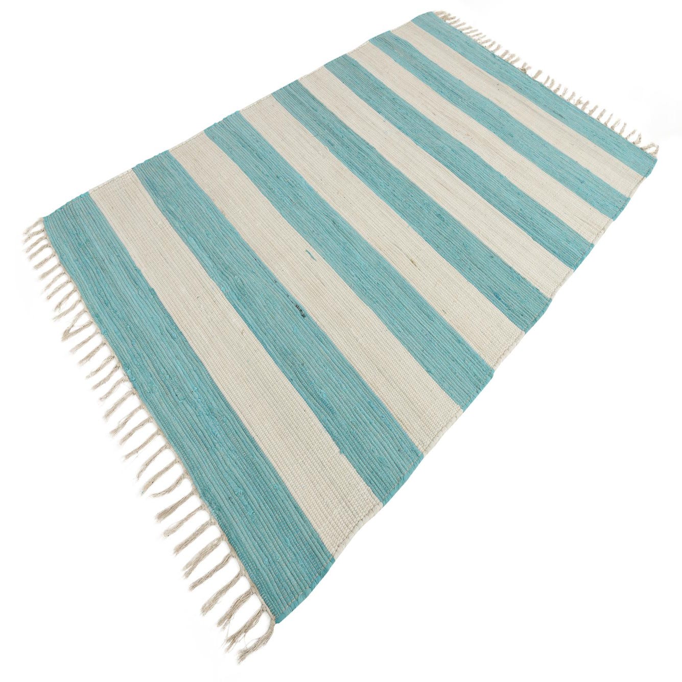 Hand woven from 100% cotton, this flat-weave rug features bold, horizontal stripes in turquoise and ivory. The alternating bands create a clean, graphic pattern while the rag-cotton construction gives the surface a slightly nubby, textured feel with subtle tonal variation in the turquoise stripes. Short natural fringe finishes the ends, adding a relaxed, handcrafted touch.
