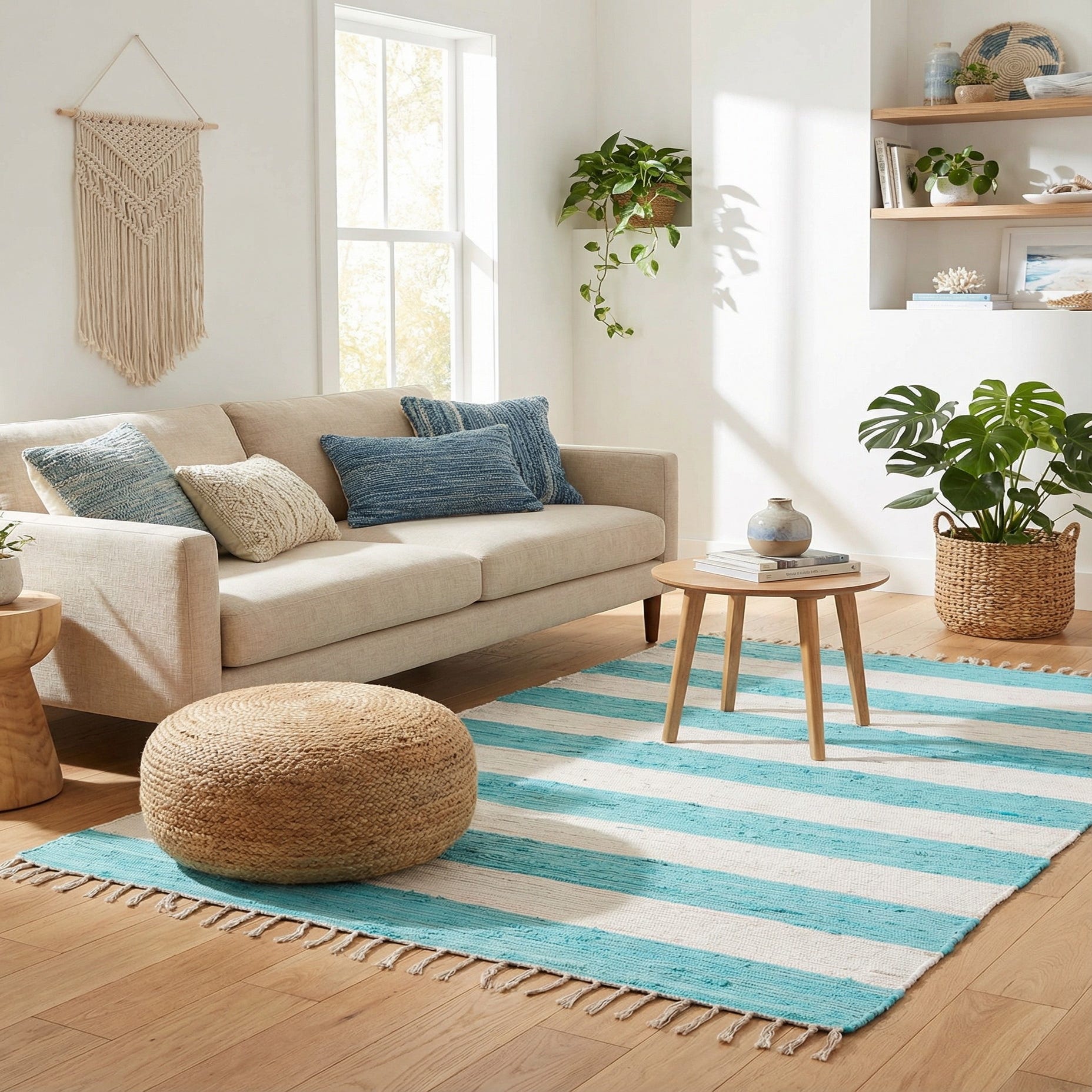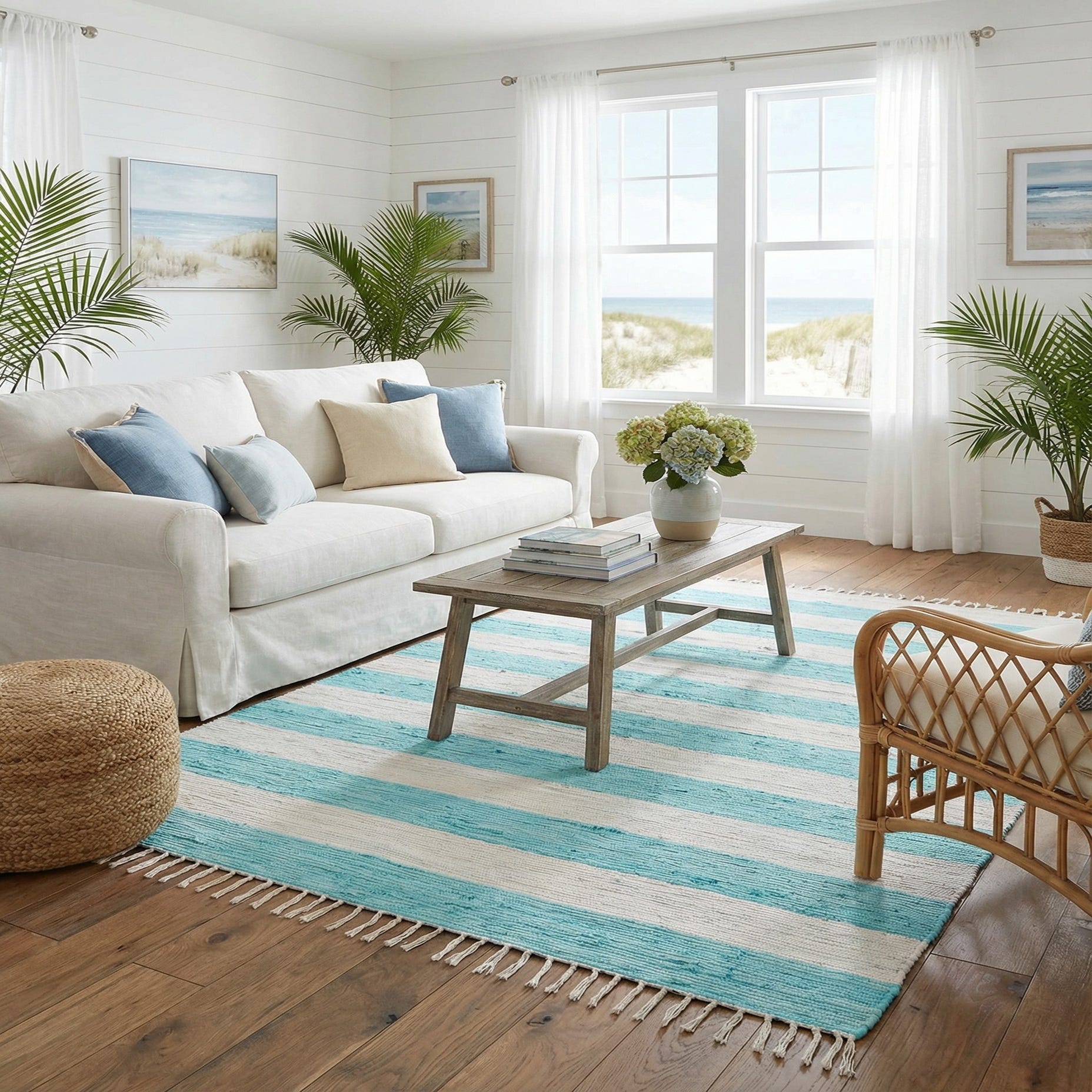 The relaxed stripe and coastal palette make this rug well suited to casual and transitional interiors — think sunlit living rooms, beach houses, or a breezy dining nook with light woods and linen textiles. It also works as an entry runner or layered under a coffee table to introduce color and texture without overwhelming the room.