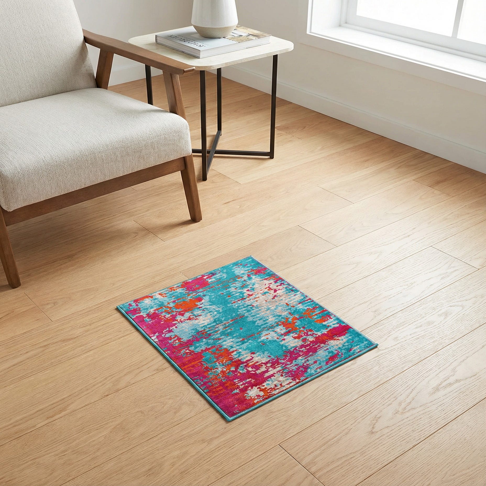 This rug works well in energetic, modern interiors that can carry strong color—think a contemporary living room anchored by a neutral sofa, a bright teen or playroom, or a coastal-inspired space that emphasizes turquoise and light blue accents. It also pairs nicely with mid-century furnishings and natural wood tones for an eclectic layered look, or with clean white and gray palettes when you want the rug to be the focal point. This piece is a sample.