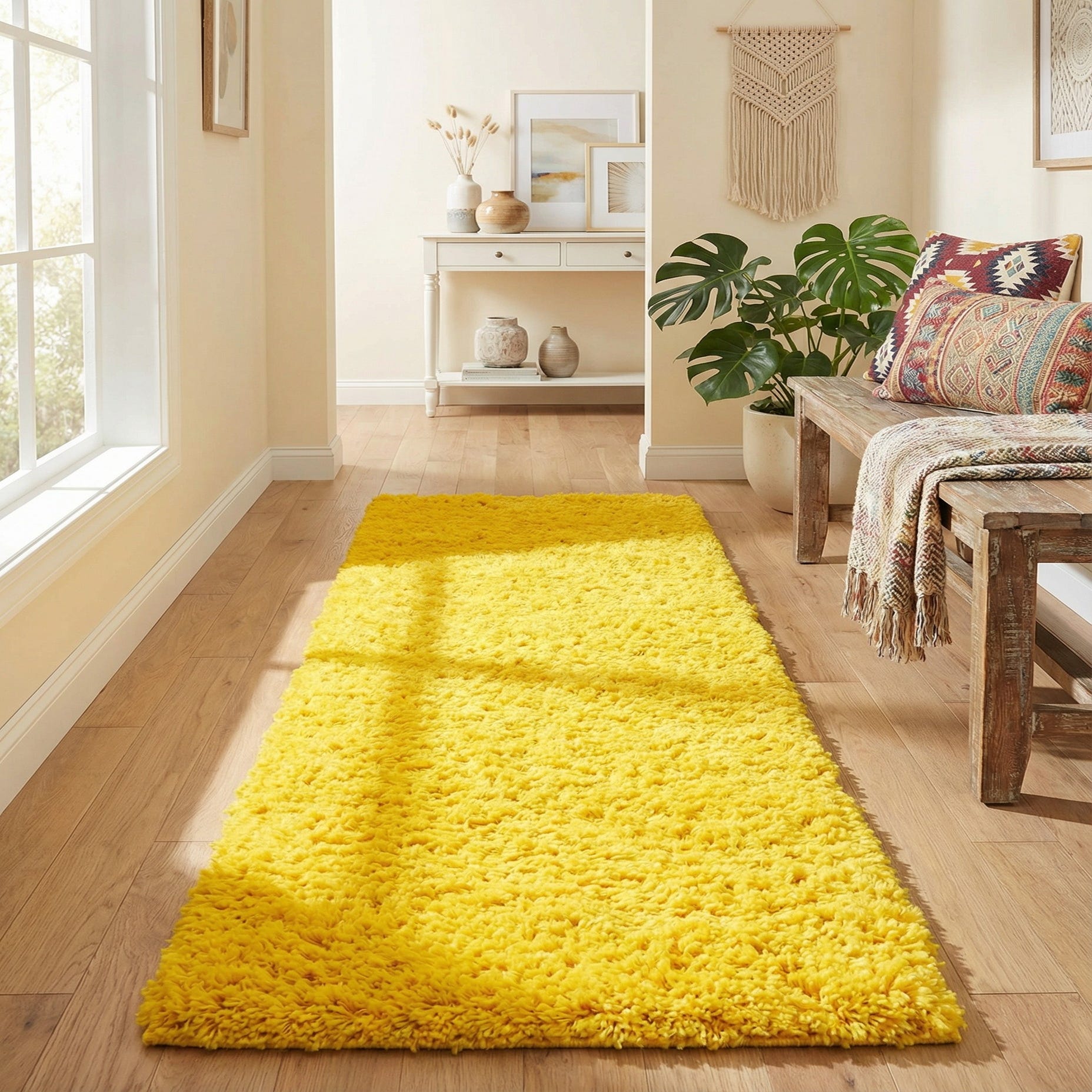A high-pile shag in a bold Tuscan Sun Yellow, this runner is all about color and texture. Machine-made from 100% polypropylene, the densely packed, twisted fibers create a cushioned, tactile surface that invites you to sink your toes in. There’s no printed motif or border—the solid construction keeps attention on the luminous color and the plush, slightly tousled pile that catches light and casts subtle tonal shifts across the surface.