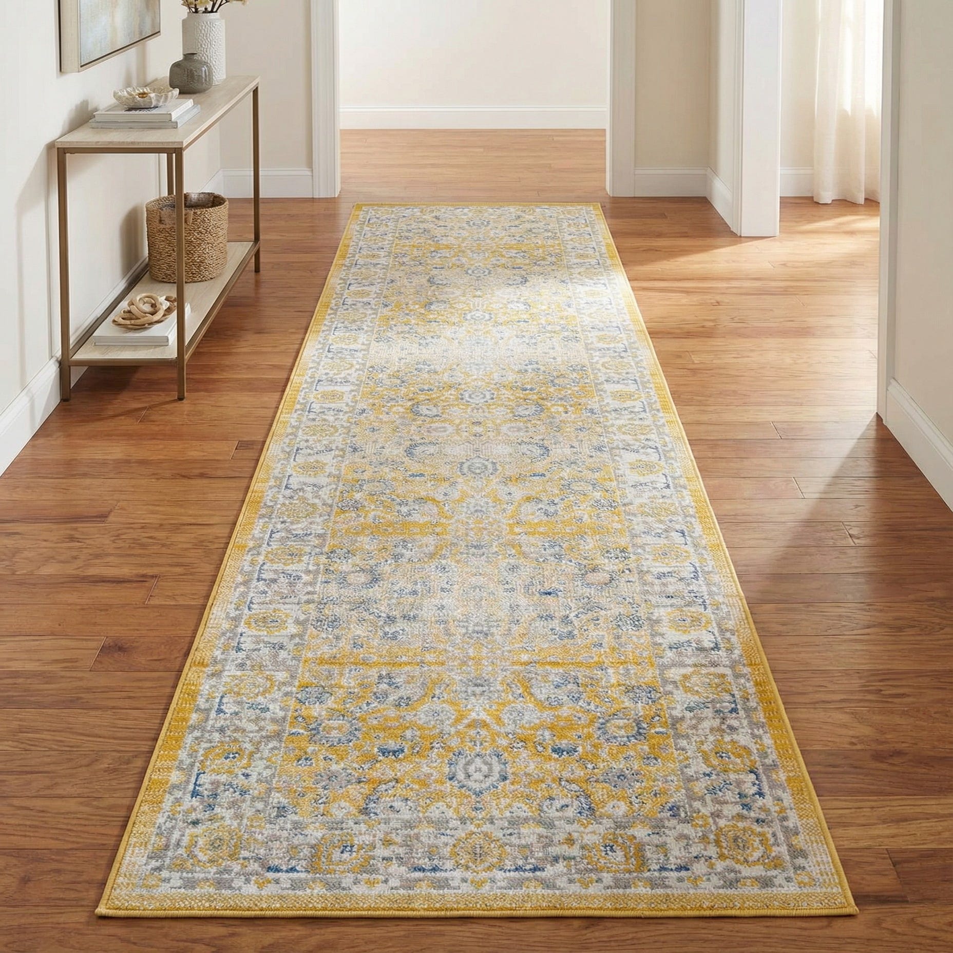 Tuscan Yellow forms the background of this runner, enlivened by an allover Persian-inspired medallion and floral pattern in soft ivory, muted gray, and touches of blue. The design carries a gently distressed finish that lets the motifs blend into one another, creating a lived-in look with clear but softened outlines. Machine-made from 100% polypropylene, the rug has a low, dense pile with a smooth surface that offers a slight, comfortable give underfoot while maintaining a defined pattern and subtle sheen.