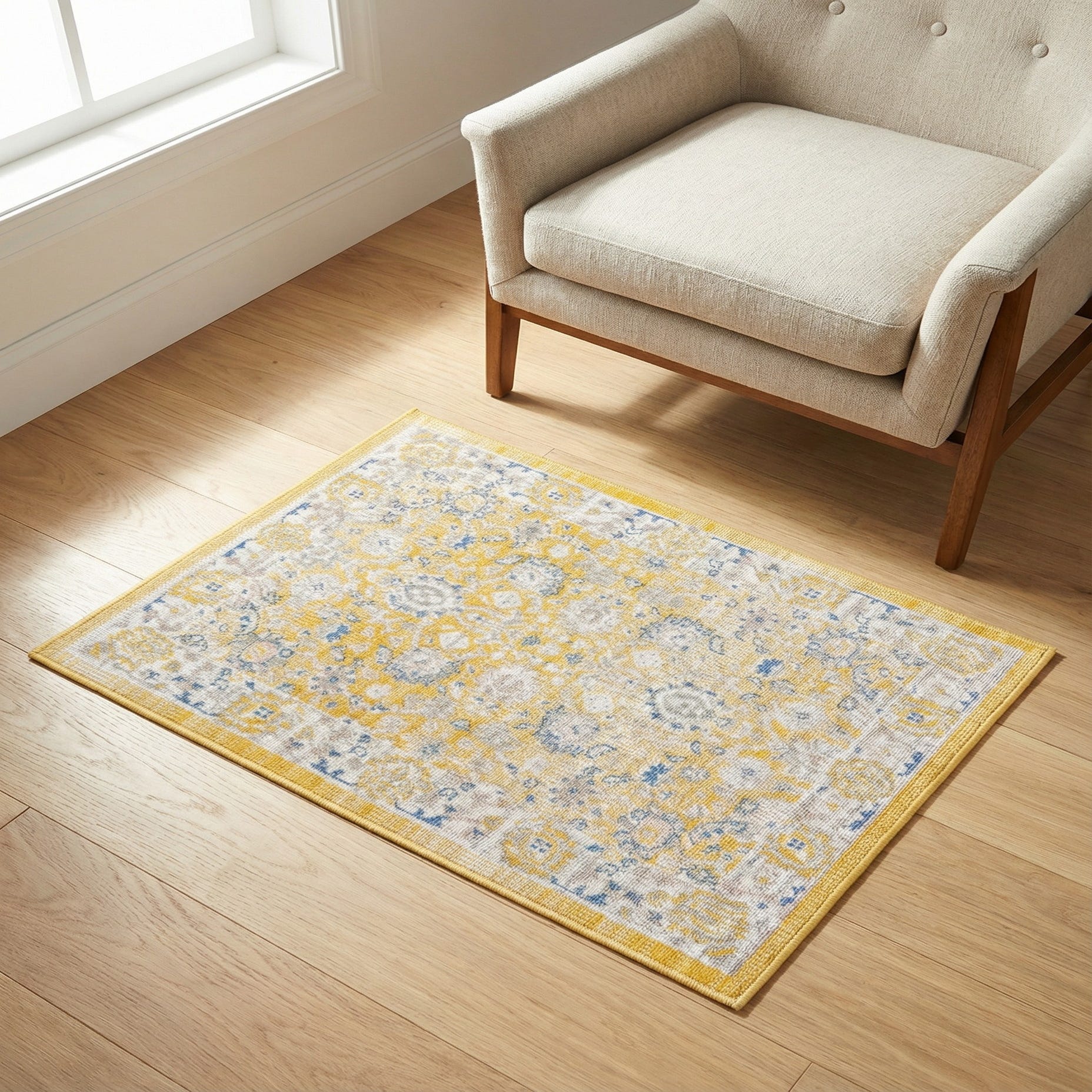 Primary color is Tuscan Yellow. Colors in this rug include: Tuscan Yellow, Blue, Ivory, Gray.