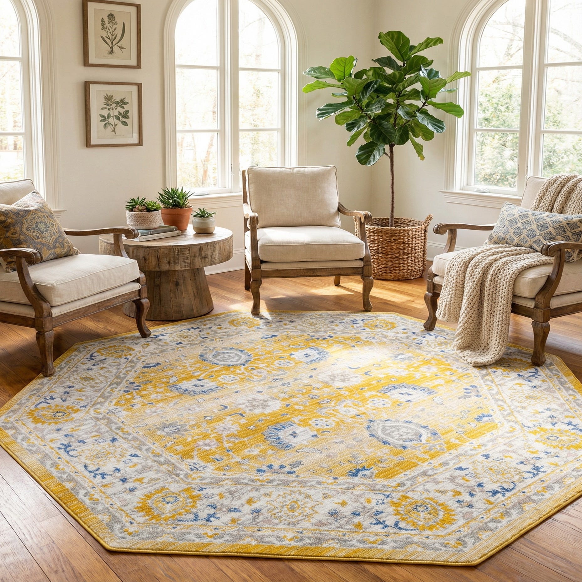 The octagonal silhouette makes this piece a strong choice for entryways, a small seating group, or beneath a round dining table where the shape can echo the furniture. It pairs naturally with soft gray or navy sofas, white trim and light wood floors, and complements transitional, coastal, or modern farmhouse interiors that favor layered pattern and gentle color contrast.