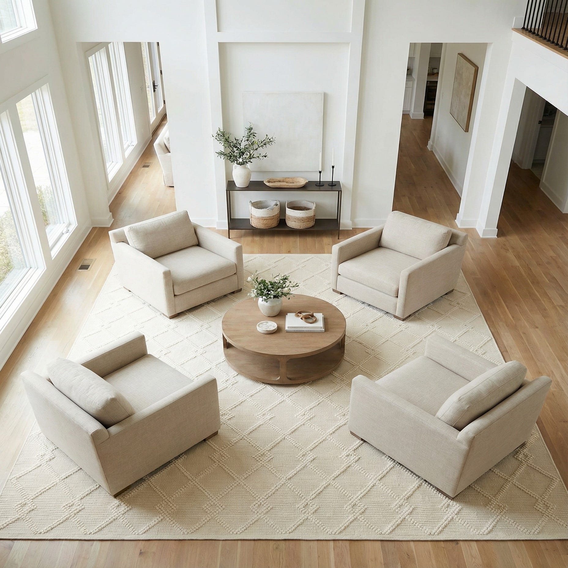 This rug works well in living rooms, bedrooms, or a sitting area where a neutral base is needed to anchor furnishings. It complements coastal, transitional, or modern farmhouse interiors—think warm wood tones, linen upholstery, and brass or matte black accents. Use it beneath a sofa and coffee table to define a conversation area, layered under a bed to add softness at the edges, or centered in a formal sitting room to introduce texture and calm contrast.
