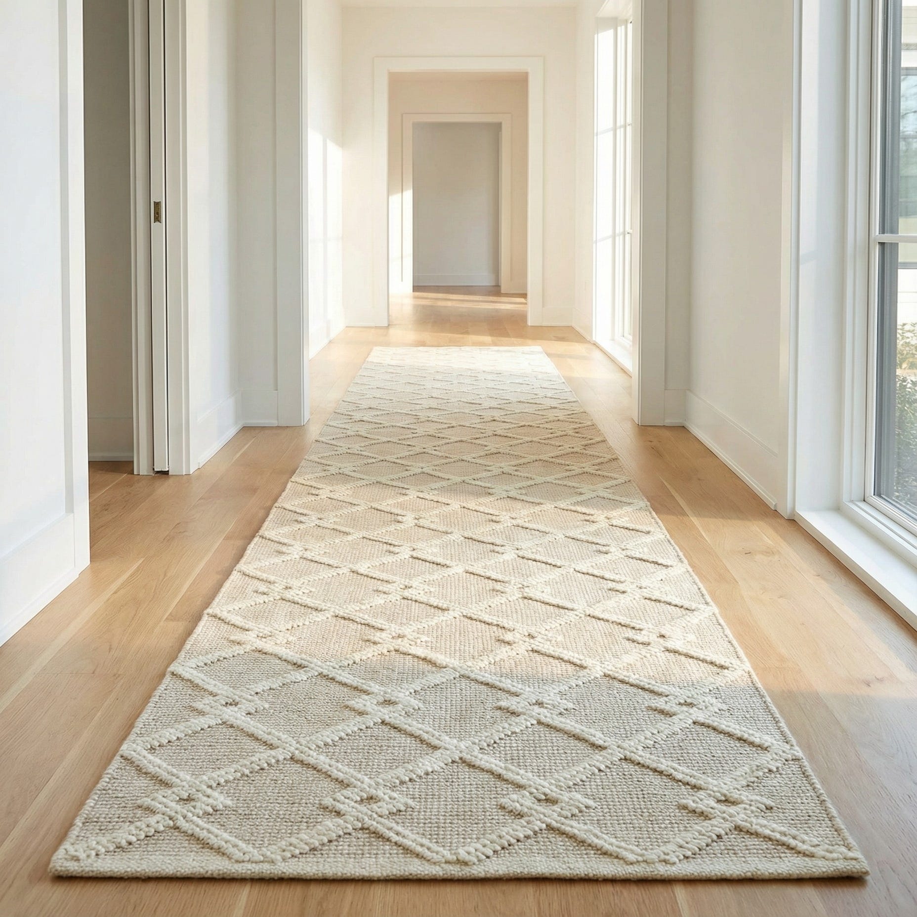 Designed for transitional interiors, the neutral palette and classic trellis pattern work well in hallways, entryways, and narrow kitchen corridors. Use it to anchor a light-filled foyer, soften the look of wide-plank hardwood, or run alongside a bed to define a bedside path. It pairs naturally with natural woods, soft grays, and linen upholstery for a calm, layered look.