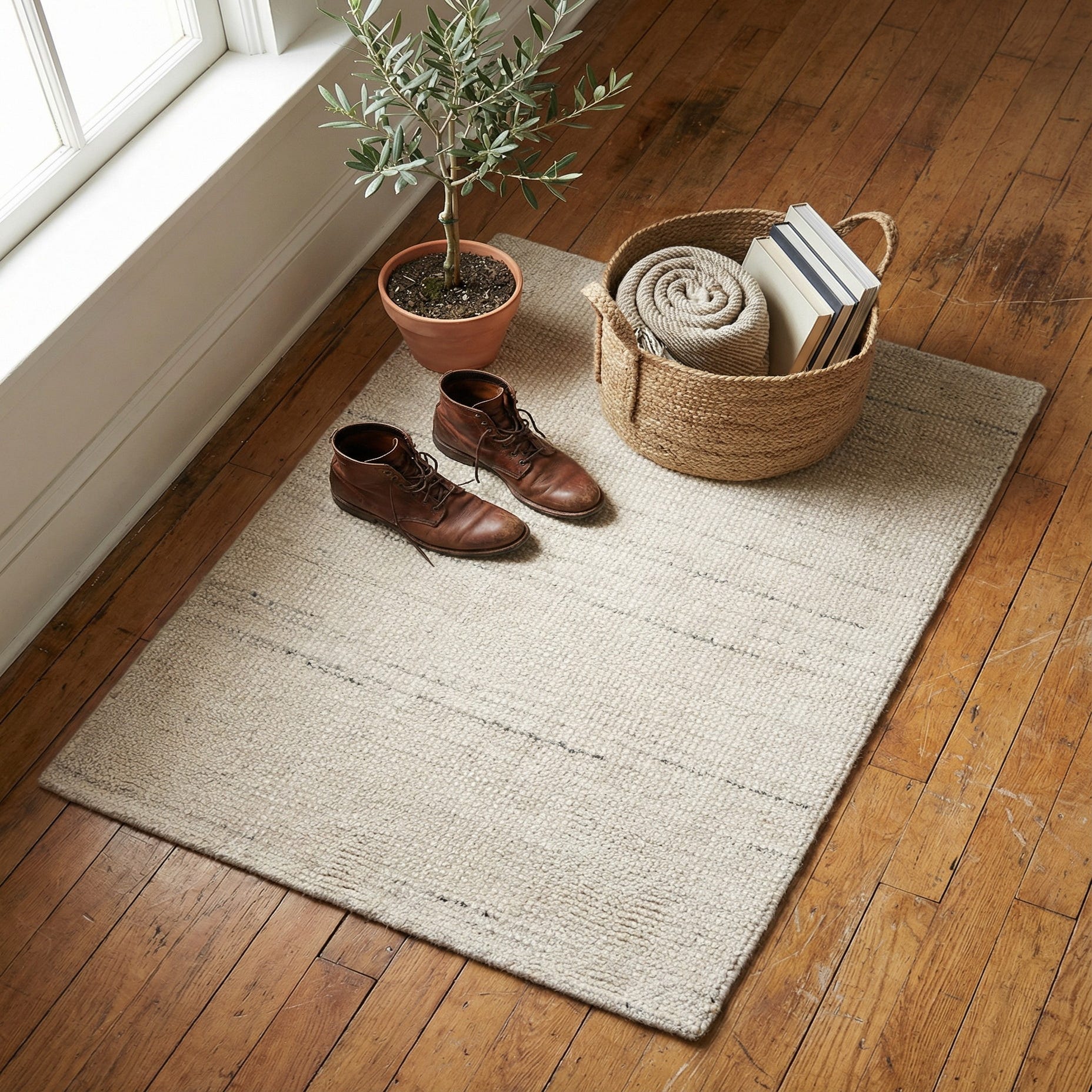 Works well as a grounding neutral in a modern farmhouse or transitional living room, layered beneath a coffee table or tucked into a cozy reading nook. Pair with natural wood furniture, linen upholstery and matte black or brass accents for a calm, collected palette; it also complements coastal and Scandinavian interiors where light, tactile neutrals are preferred.