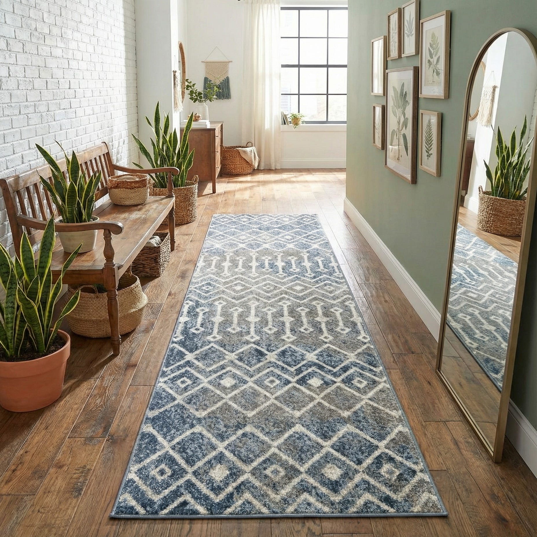 Machine-made construction delivers consistent texture and color throughout, making this runner well suited for narrow, high-traffic zones. Place it along an entry hall to anchor a layered vignette, use it in a kitchen aisle to add pattern and warmth, or run it down a bedroom corridor to connect bedside furnishings. The vintage blue, ivory, and gray palette pairs easily with light woods and white trim for a coastal or modern farmhouse look, and it complements woven accents, mixed textiles, and relaxed contemporary furnishings for a casual, lived-in feel.
