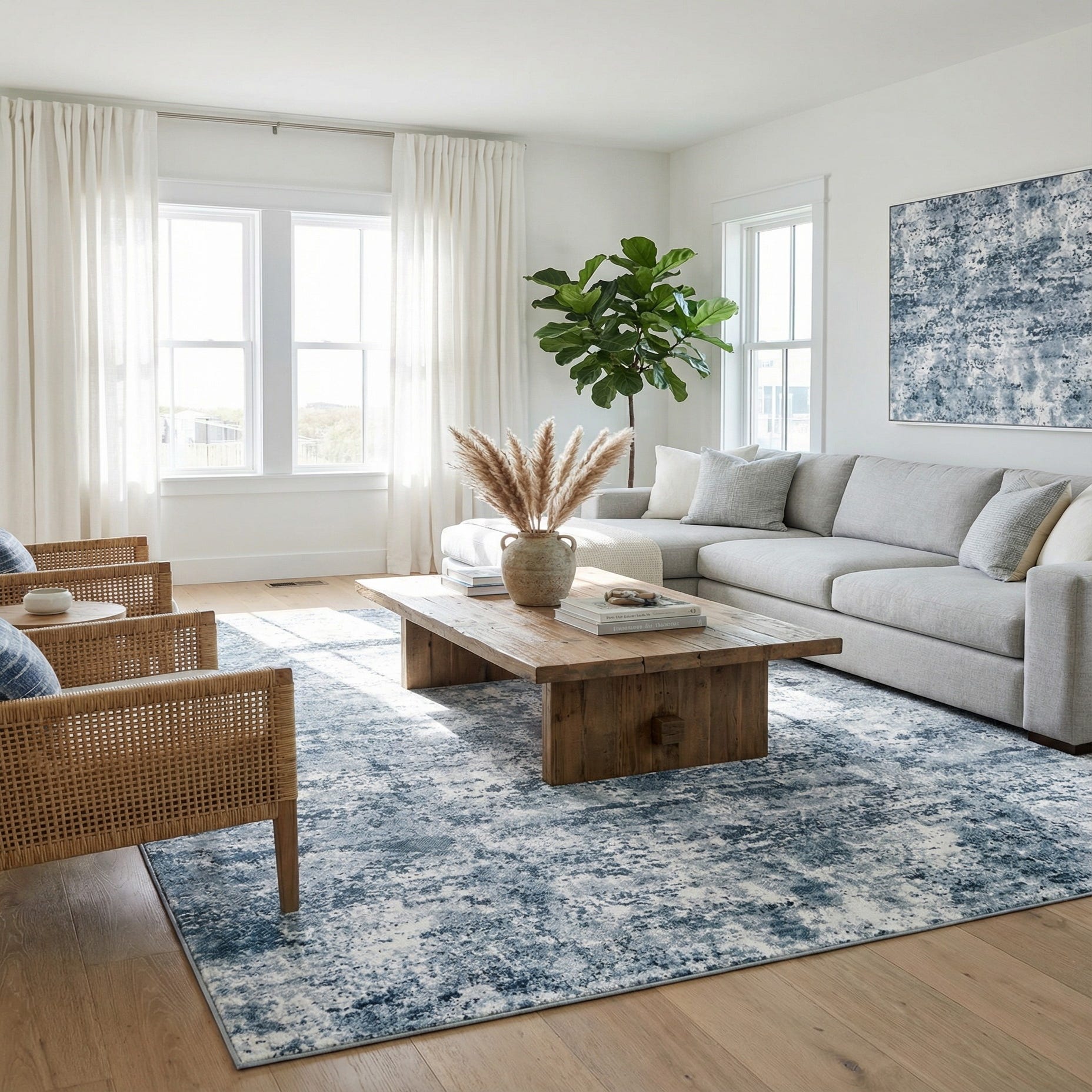 The coloration and understated pattern make this piece easy to pair with a range of interiors: place it beneath a large seating group to anchor a living room, center it under a dining table to soften a dining area, or layer it in a master bedroom for calm, cool tones. It complements light-wood furniture, gray or ivory upholstery, and coastal, transitional, or modern settings where a muted, sophisticated backdrop is desired.